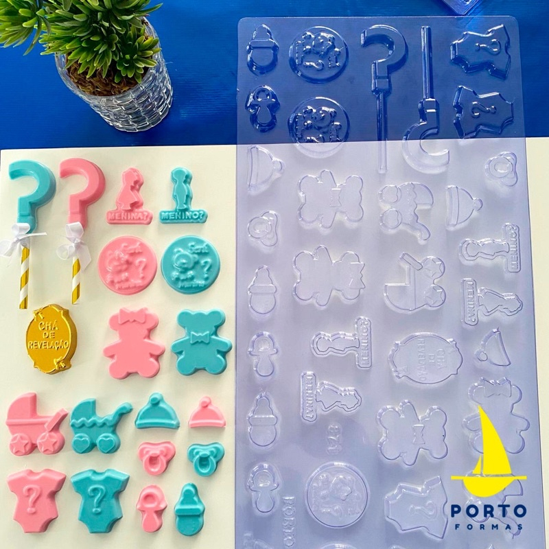PORTO FORMAS Forma para chocolate folha moldagem cha revelação cha de bebe cod p871 Ideal para produção de chocolates com muita precisão e praticidade.