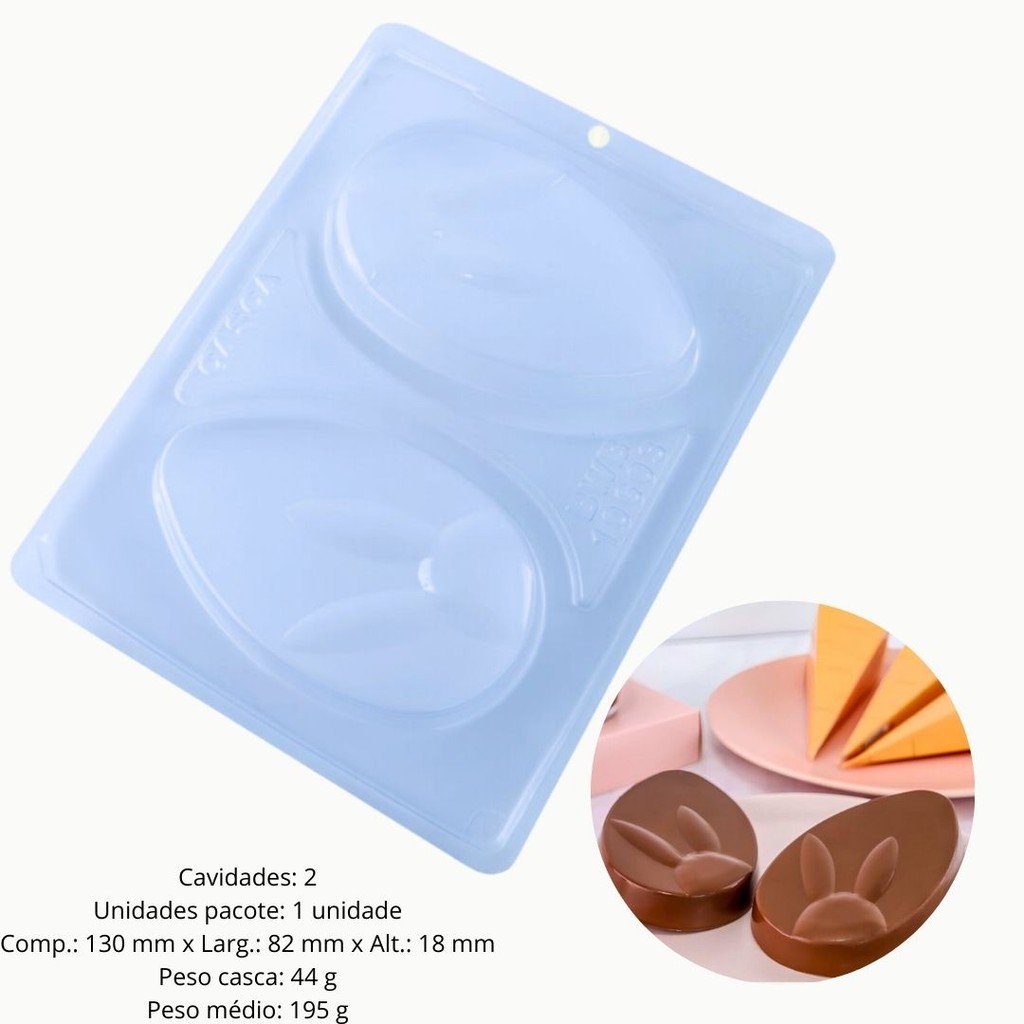 Forma especial com silicone (3 partes), ideal para produção de chocolates com muito mais praticidade e precisão, possui uma “marquinha” indicando a quantidade de chocolate necessária, levando para geladeira uma única vez, ela proporciona uma casca uniforme com acabamento perfeito sempre com o mesmo peso, abaixo mais informações do produto. Cavidades: 2 Unidades pacote: 1 unidade Comp.: 130 mm x Larg.: 82 mm x Alt.: 18 mm Peso casca: 44 g Peso médio: 195 g