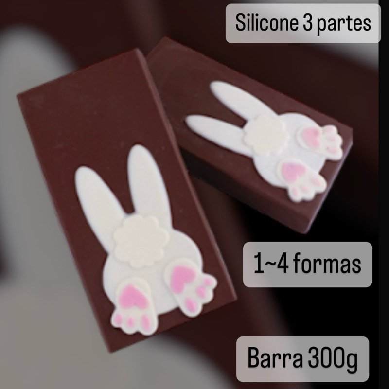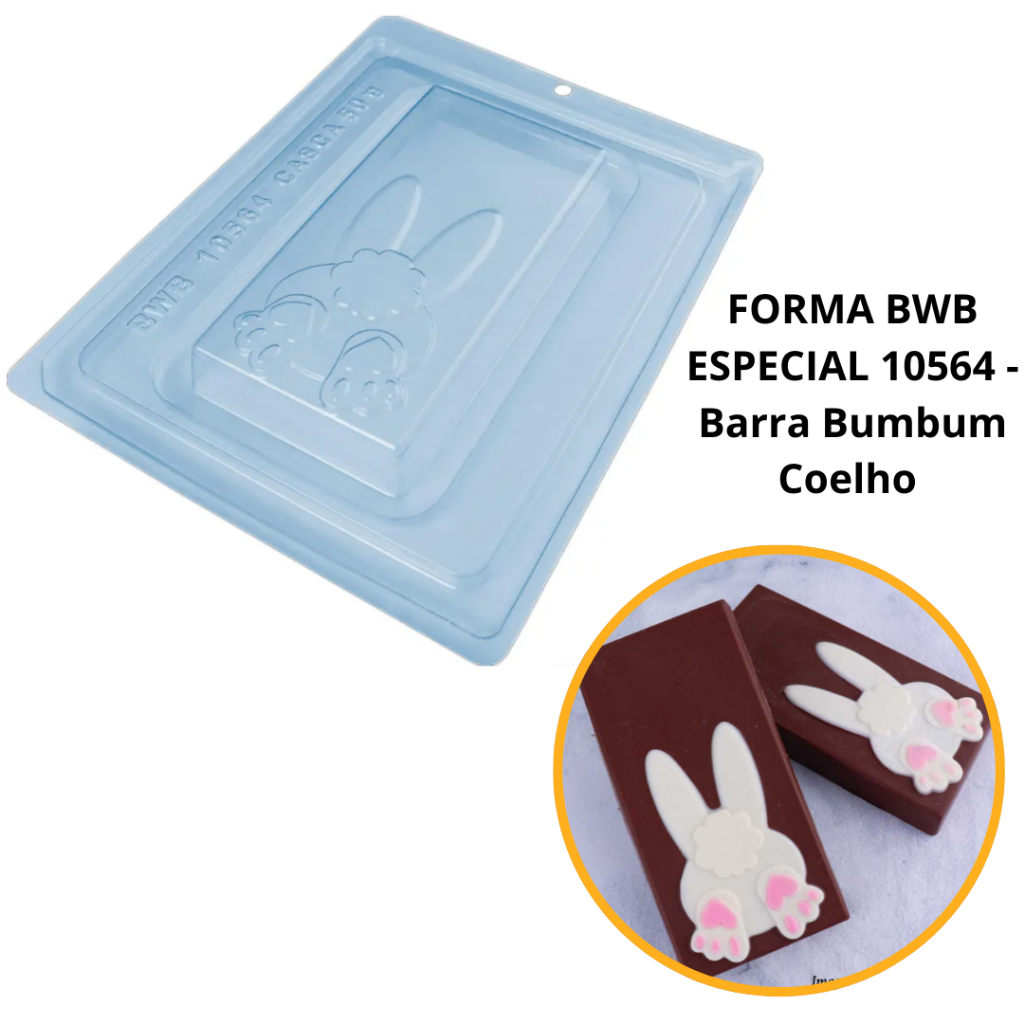 MODELO: FORMA BWB BARRA 300g COELHO PÁSCOA- CÓD.:10564 FORMA ESPECIAL (3 PARTES), FACILIDADE DE USO E PRECISÃO NA PRODUÇÃO DE CHOCOLATES. ELAS SÃO PROJETADAS PARA FACILITAR A PRODUÇÃO COM PROCESSOS SIMPLES E RÁPIDOS. E GARANTEM CHOCOLATES COM CASCAS UNIFORMES, ACABAMENTO BRILHANTE E PESO CONSISTENTE. QUANTIDADE: 1 UNIDADE COR: TRANSPARENTE MATERIAL: ACETATO(PVC) E SILICONE PESO CASQUINHA: 50g PESO MÉDIO: 300 g CAVIDADES: 1 TAMANHO DA CAVIDADE: COMP.: 16,05 cm x LARG.: 8,05 cm x ALT.: 2,0 cm