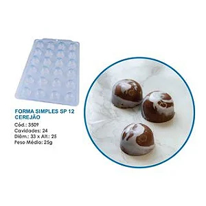 3509 - SP 12 Cerejão (3509) Semiprofissonal Simples Forma Simples, ideal para produção de chocolates com muita praticidade. Abaixo mais informações do produto. mais informações Descrição do Produto Cavidades: 24 Diâm.: 33 x Alt.: 25 Peso Médio: 25g