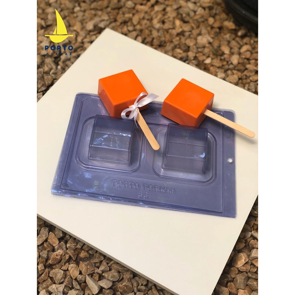 Forma Especial, 3 partes (2 de acetato e 1 de silicone) ideal para produção de chocolates com muita precisão e praticidade. Cód. 53 (02 cavidades) 60 x 60 x 28 (mm) Peso da casquinha: 26g