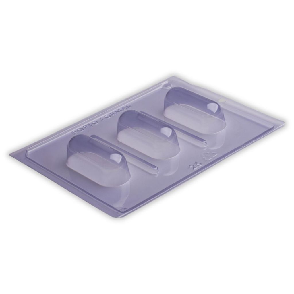 Forma Especial, ideal para produção de chocolates com muita precisão e praticidade. Cód 25 (3 cavidades) 85 x 35 x 25 (mm) Peso da casquinha: 18g