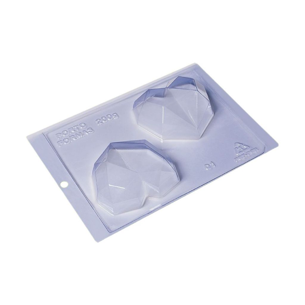CORAÇÃO DIAMOND 200G - CÓD 01 (02 cavidades) 100 x 92 x 30 (mm) Peso da casquinha: 55g Ideal para produção de chocolates com muita precisão e praticidade.