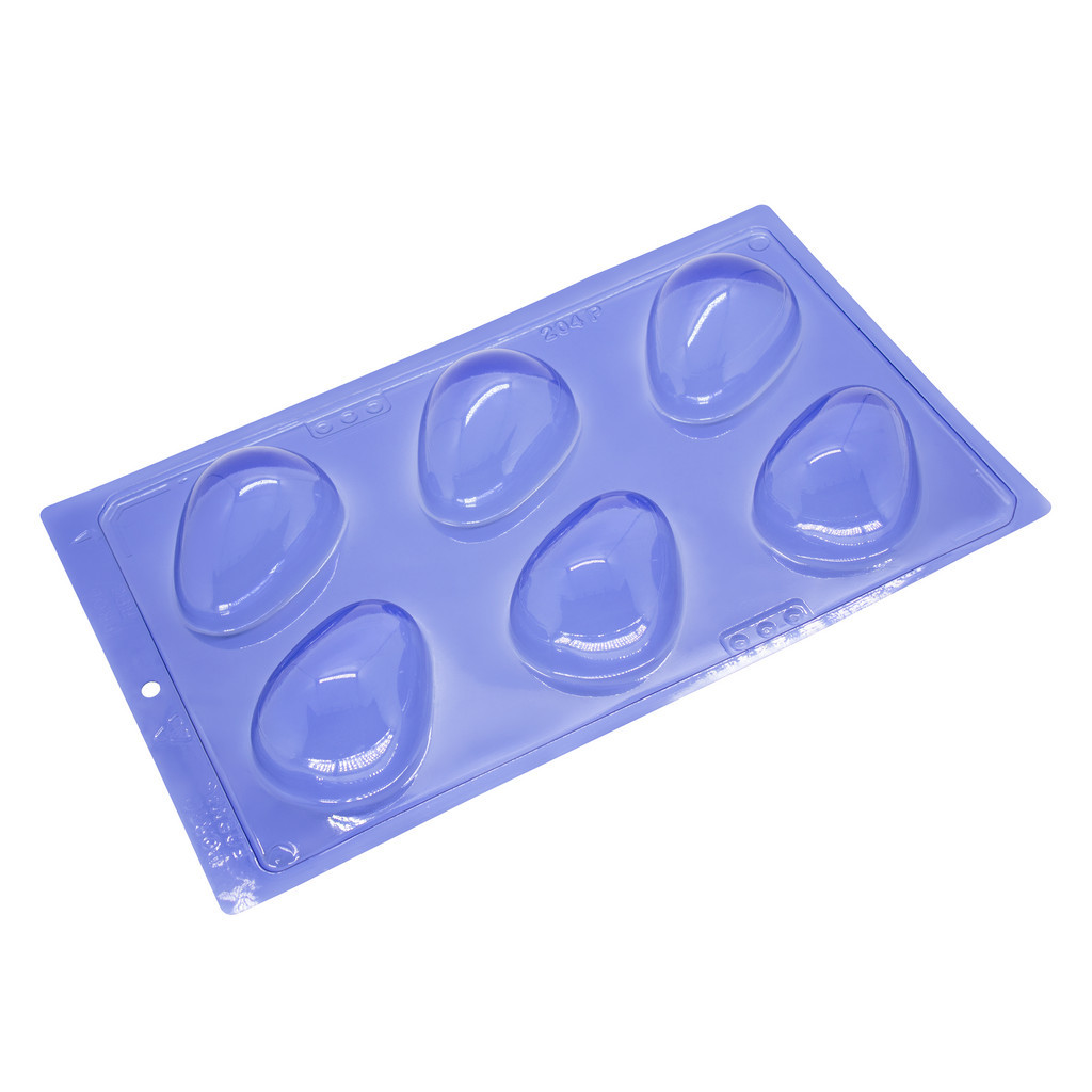Forma Profissional, 3 partes (2 de acetato e 1 de silicone) ideal para produção de chocolates com muita precisão, praticidade e alto rendimento. Cód 204 (6 cavidades) 94 x 69 x 31 (mm) Peso da casquinha: 85g