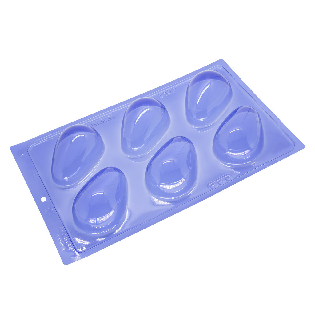 Forma Profissional, 3 partes (2 de acetato e 1 de silicone) ideal para produção de chocolates com muita precisão, praticidade e alto rendimento. Cód 205 (6 cavidades) 108 x 71 x 27 (mm) Peso da casquinha: 125g