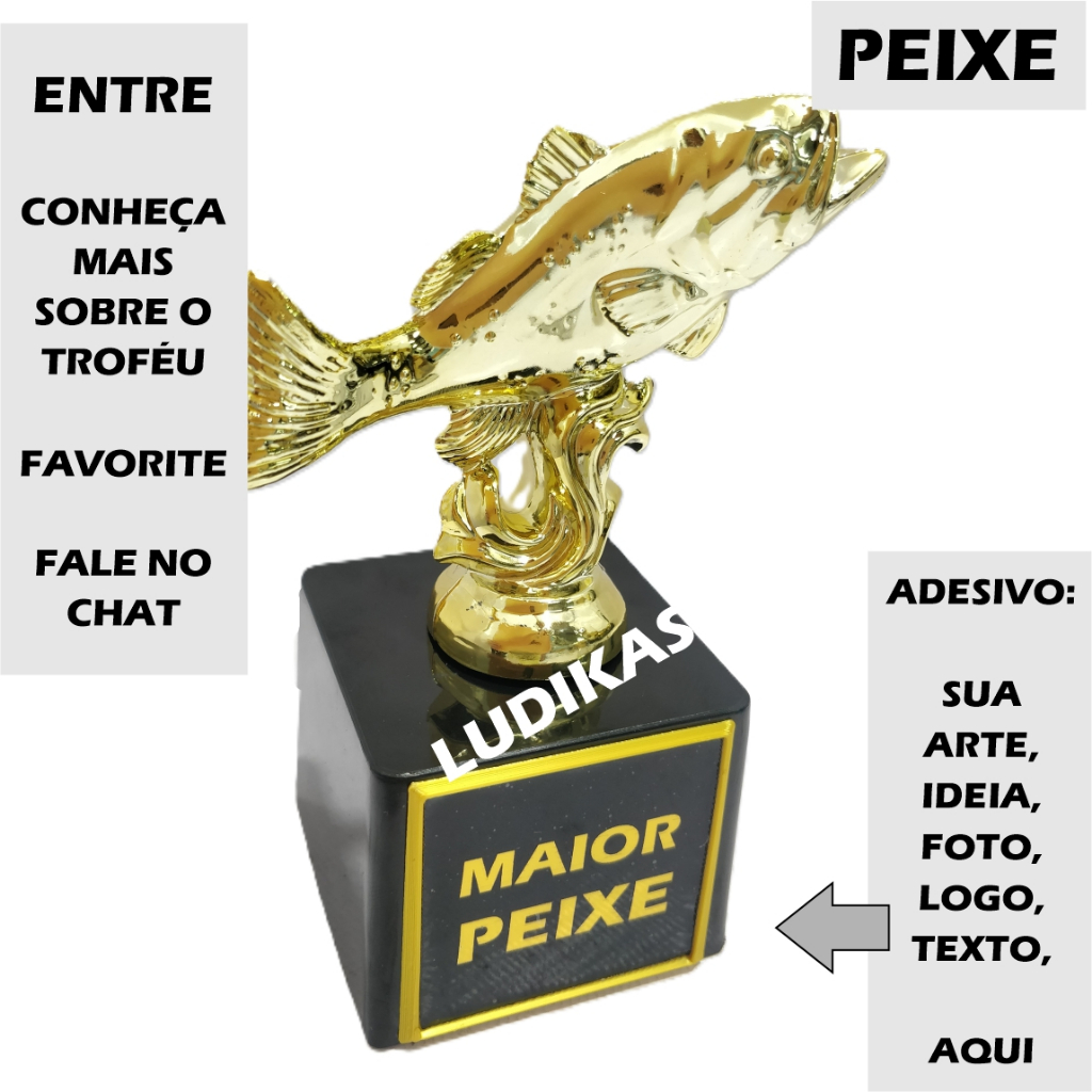 06032026 LEIA LEIA ABAIXO LEITURA IMPORTANTE ABAIXO Para a compra do PRODUTO PERSONALIZADO: => As INFORMAÇÕES da arte devem ser ENVIADAS NO CHAT DO SHOPEE. => Envie as informações ANTES DA COMPRA ou no máximo EM ATÉ 1 HORA APÓS A COMPRA. => SEM as informações que você deve passar o produto SERÁ ENVIADO SEM PERSONALIZAÇÃO para cumprir os que a SHOPEE NOS IMPÕE. => A shopee nos dá um prazo curto e somo PUNIDOS SE NÃO ENVIAMOS PARA ESPERAR UM CLIENTE SUMIDO DO CHAT RESPONDER. => AGRADECEMOS A COMPREENSÃO ACIMA LEITURA IMPORTANTE ACIMA LEIA LEIA DESCRIÇÃO DOS ITENS Troféu Peixe Ouro 13cm BL1 Medidas da Base Preta: Altura: 5cm Largura: 6cm PERSONALIZAÇÃO Adesivo Brilhoso, podendo ser colorido, aplicado na base do troféu. Medidas aproximadas do adesivo: Largura de 5cm e Altura de 4cm