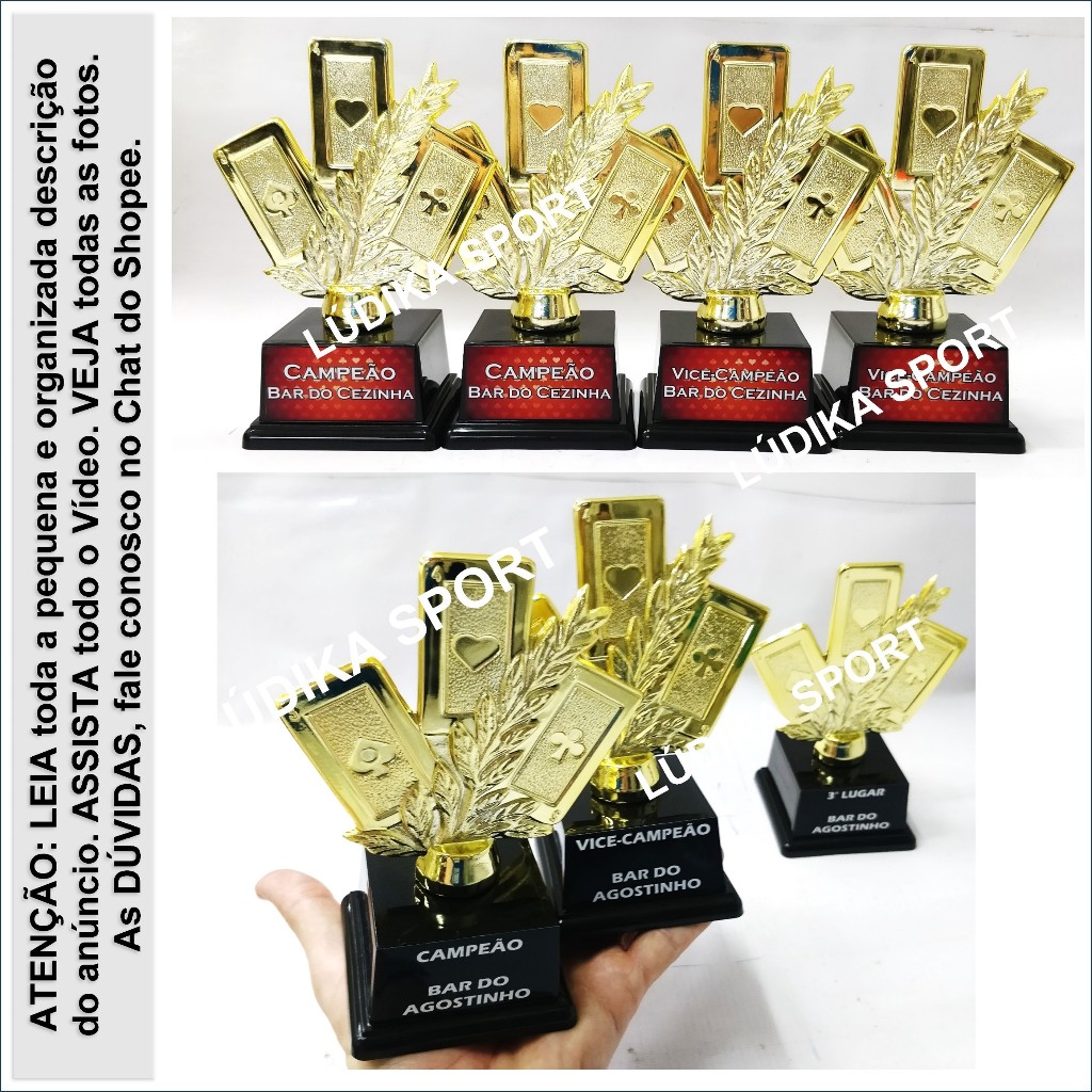 | 1 a 5 Troféu Baralho 3Cartas M Ouro 16cm BV4 {Personalizo} Kit Desc... este produto | R$ 34,00 | — | 4.9/5 | 3 |
