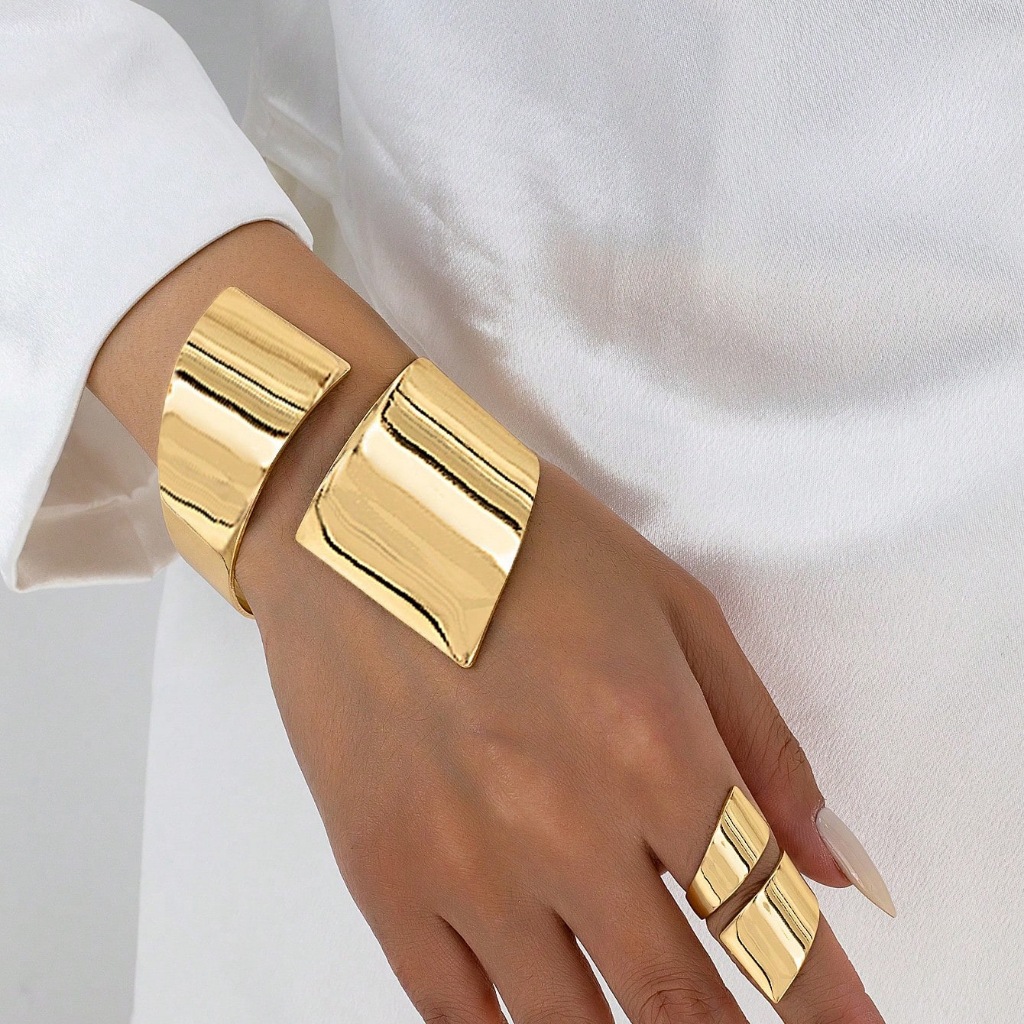 Realce sua elegância com este conjunto moderno de pulseira e anéis dourados, feito para mulheres que amam estilo e sofisticação. Com design geométrico e minimalista, as peças possuem acabamento espelhado que reflete a luz de forma incrível, trazendo um toque de luxo e poder para qualquer look. 💫 Detalhes do produto: Material: Liga metálica de alta qualidade com banho dourado e prata. Estilo: Moderno, elegante e fashion. Pulseira ajustável e anéis abertos para melhor encaixe. Ideal para festas, eventos, jantares e uso diário com muito charme. ✨ Combine com vestidos, camisas ou looks casuais — esse conjunto transforma qualquer visual em algo único e sofisticado.