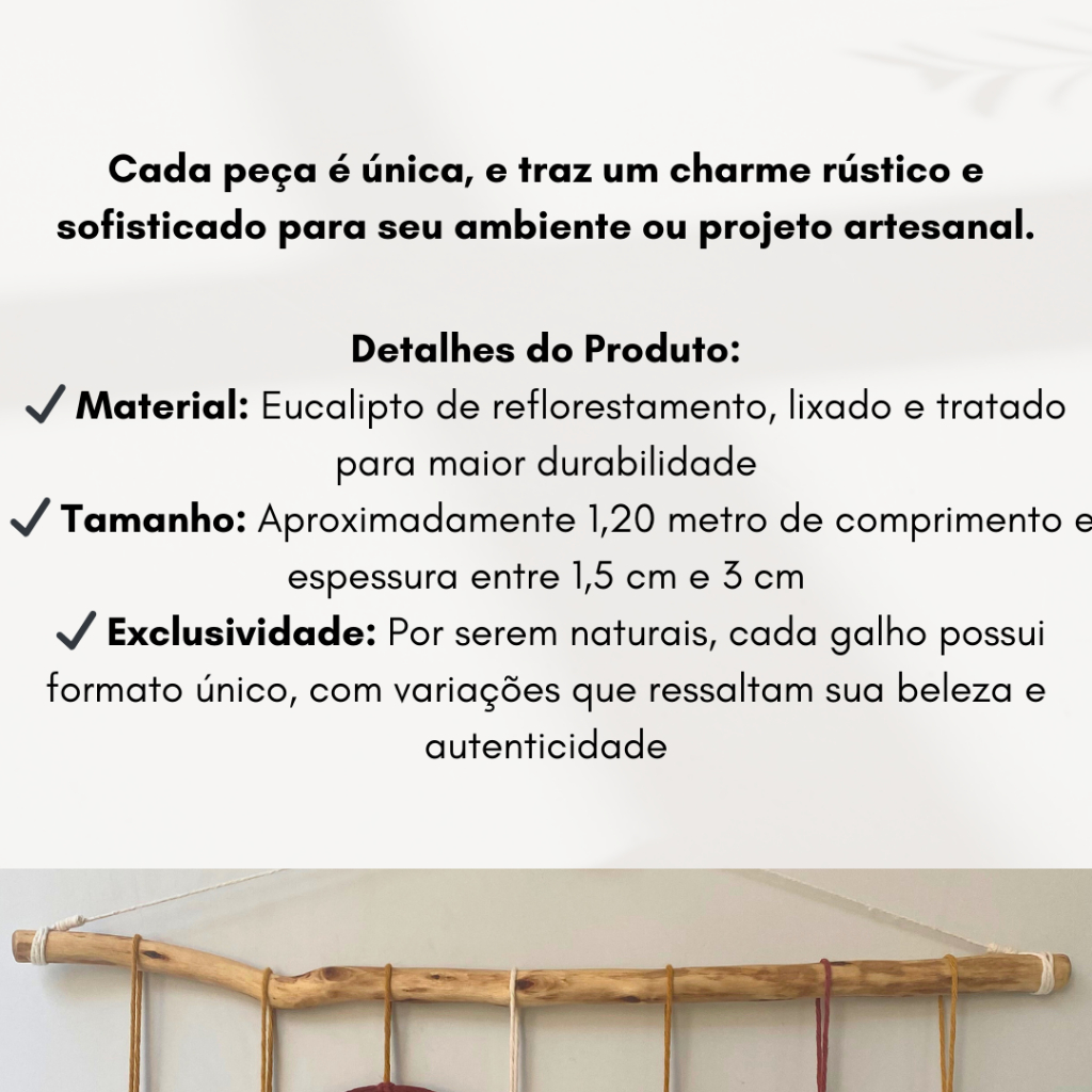Galho de Madeira para Macramê – 1,20 Metro | Natural e Tratado Perfeito para projetos artesanais e decorações no estilo boho chic, este galho de eucalipto tratado é ideal para dar suporte a peças de macramê, criar composições rústicas e adicionar um toque natural ao ambiente. Características do Produto: ✔ Material: Eucalipto de reflorestamento, lixado e tratado para maior durabilidade ✔ Comprimento: Aproximadamente 1,20 metro ✔ Espessura: Varia entre 1,5 cm e 3 cm ✔ Acabamento: Superfície lisa, com variações naturais que tornam cada peça única ATENÇÃO: *Caso queira uma espessura específica, envie uma mensagem no chat antes da compra, para verificar a disponibilidade.* Ideal para: - Estruturas de macramê Decoração boho chic e rústica Artesanatos e projetos DIY Composições naturais para ambientes internos. Por ser um produto natural, cada galho possui formato exclusivo, tornando sua peça ainda mais especial. Envio seguro e embalagem cuidadosa para garantir que o produto chegue em perfeito estado. Gostou? Adicione ao carrinho e transforme sua decoração com um toque artesanal e autêntico.