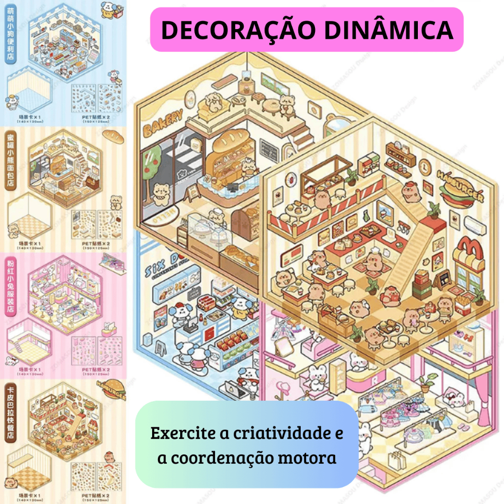 Tendência TikTok e Kawaii ✅Cartelas de adesivos com ilustrações fofas no estilo kawaii. ✅Cenários temáticos (biblioteca, café de gatos, dia ensolarado e padaria) impressos em papel cartão (13x13 cm) para montar e personalizar. ✅Guia ilustrativo: No verso da embalagem, há a imagem do cenário finalizado para servir como referência na aplicação dos adesivos. Vantagens: ✅Ajuda a aliviar a ansiedade e o estresse. ✅Estimula a imaginação e proporciona um momento de desconexão das telas. ✅Indicado para todas as idades, sendo perfeito para férias escolares ou para criar momentos divertidos em família. ✨ Não perca a chance de ser o primeiro a experimentar essa tendência que está bombando no TikTok e no Instagram! 📦 PRODUTO COM NOTA FISCAL 🔒 COMPRA SEGURA