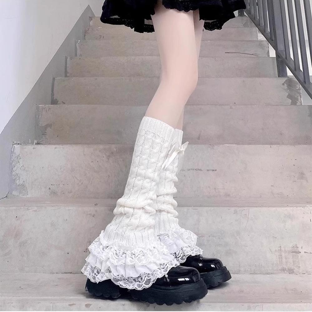 1 Par De Polainas De Malha Com Babados Lolita | Meias Desleixadas Decoração De Laço Acabamento Em Renda Para Moda Kawaii