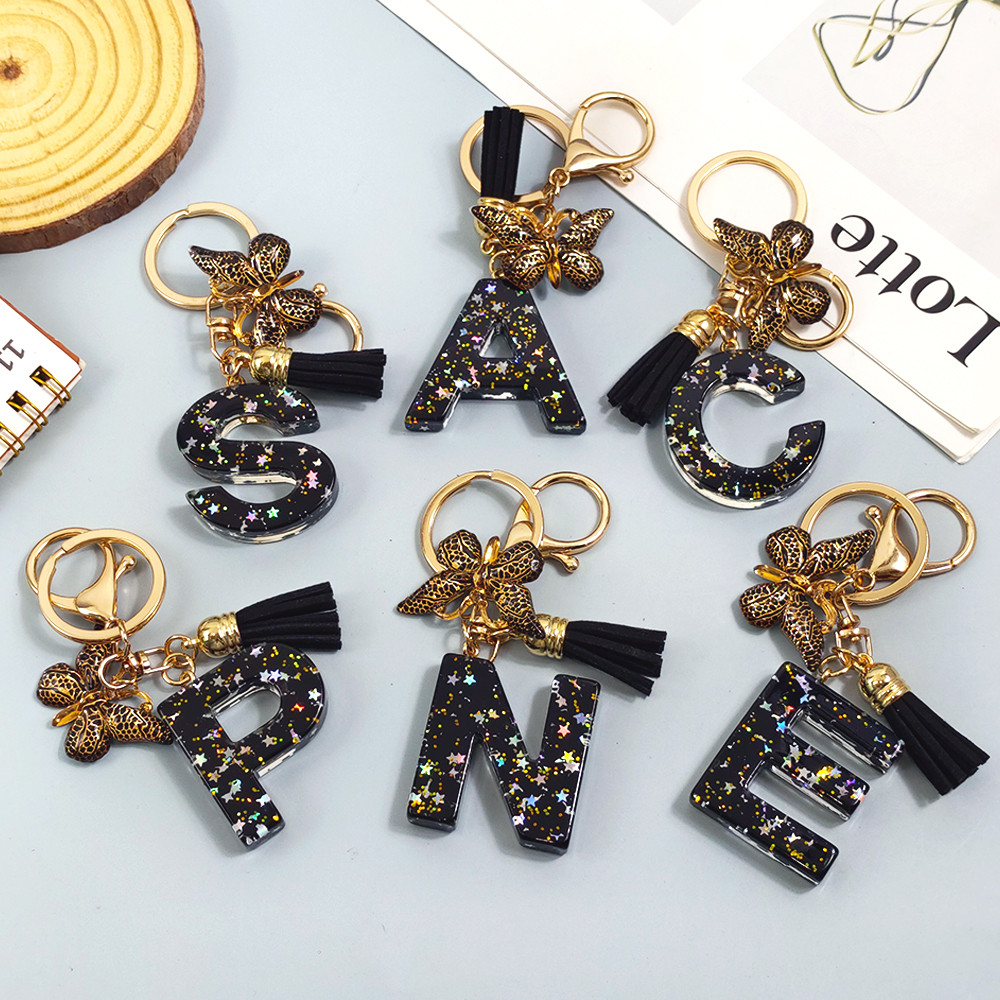 1 Pçs Colorido Lantejoulas Estrelas Letras Chaveiro Preto Borla Borboleta Iniciais Bolsa Pingente