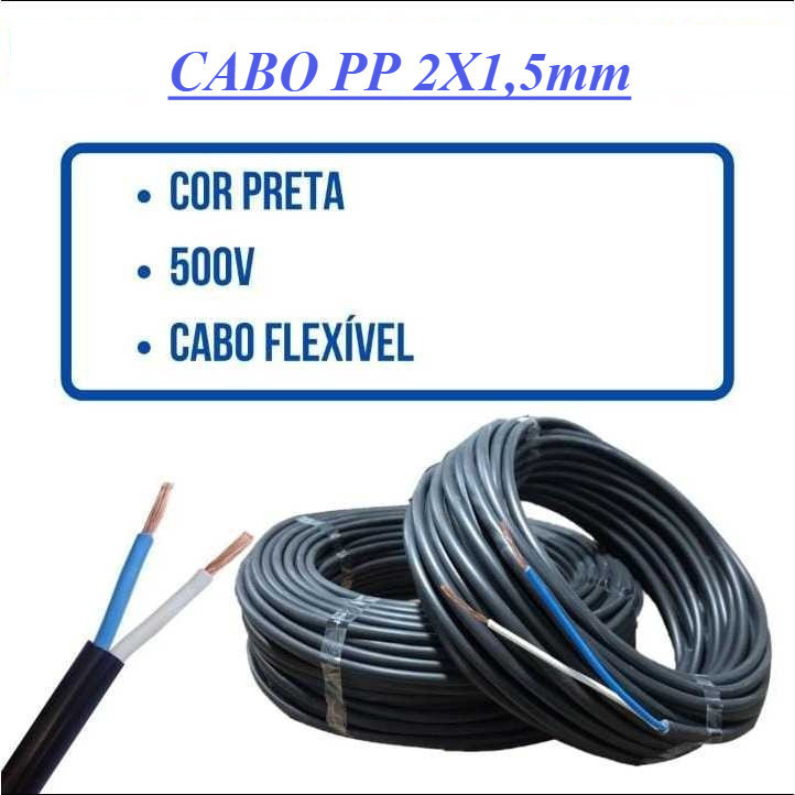 Cabo Fio PP Flexível 2x1,50mm Rolo 50 Metros PREÇO DE ATACADO -------------------- Modelo: Cabo Comando PP 2x1,5mm - Preto - 500V - Flexível Diâmetro: 2x1,50mm Comprimento: 50 metros Material da cobertura: PVC Material condutor: Alumínio Cobreado Especificações Técnicas. --Cabo Flexível 2x1,50mm --Comprimento de 50 metros. Instalar conforme NORMA NBR 5410:2004 e ABNT 247-1 Produto novo. Na embalagem original. Lacrado. Sem uso. PRODUTO CONDUTOR DE ELETRICIDADE, SEMPRE CONSULTAR ELETRICISTA RESPONSAVEL. NÃO FAÇA NADA POR CONTA PRÓPRIA SEM O DEVIDO CONHECIMENTO. =================================================================== OBS: Caso esteja procurando produto para comparar a qualidade com "Grandes Marcas", pedimos encarecidamente que não compre esse Produto, o produto foi desenvolvido para atender Custo X Benefício.