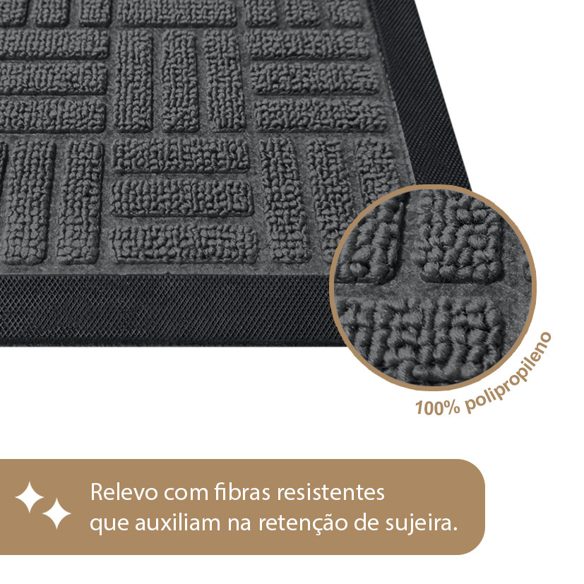 VANTAGENS - Superfície em alto relevo, retém a sujeira; - Fibras resistentes, não solta pelos; - Base emborrachada antiderrapante; - Evita tropeços, não levanta as pontas; - Material firme e pesado, não sai do lugar; - Antimofo, pode molhar; - Alta qualidade, acabamento Premium; - Para ambientes externos e internos; - Super fácil de limpar. CONTÉM: 1 unidade(s) COR: Grafite DIMENSÕES - Largura: 60cm - Comprimento: 90cm MATERIAL - Superfície: 100% Polipropileno - Base: 100% Borracha SUPER FÁCIL DE LIMPAR - Limpeza Leve: Sacudir o tapete ou utilizar o aspirador em pó. - Limpeza Pesada: Lavar com água e sabão neutro. Um produto Idealiza Comércio de Utilidades.