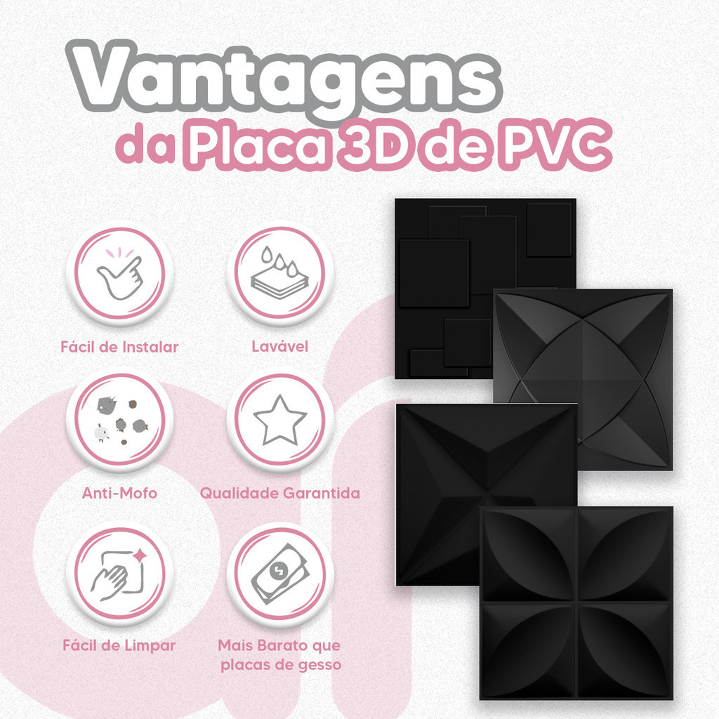 COLAÍ ADESIVOS 1 unidades CASA NOVA SEM REFORMA!!! Paredes lindas e decoradas sem dores de cabeça! Imagine você mesmo transformando e decorando um cantinho especial de sua casa ou trabalho. A Placa de PVC Colaí é versátil, prática, fácil de aplicar e com baixíssimo custo. Paredes lindas e decoradas sem dores de cabeça! MODELOS EXCLUSIVOS - ENVIAMOS PARA TODO O BRASIL TODAS AS NOSSAS PLACAS ACOMPANHAM FITA AUTOCOLANTE DUPLA FACE TODAS AS PLACA SÃO ALTO RELEVO 3D! Vantagens: •Faça Você Mesmo! • Aplicação rápida, fácil e sem sujeira; • Lavável (com pano macio umedecido em água e sabão neutro) e resistente à água; • Antimofo e antibacteriano; • Não tóxico; • Alta durabilidade; • Pode ser aplicado na parede sem a necessidade de outros acabamentos, massa corrida, tinta ou reboco; • Produto de Alta qualidade, caso queira mudar a cor do produto, pode pintar com tinta spray, automotiva ou látex; • Corte fácil com tesoura e estilete para acabamentos; Tamanho de cada Placa: 50X50cm Área de cobertura de cada placa: 0,25m² São necessárias 4 placas para render 1 metro quadrado. DADOS TÉCNICOS DO PRODUTO: – Cor: Preto – Espessura: 0,50mm – Material: Poliestireno de Alto Impacto IMPORTANTE: – Pedidos em datas diferentes podem haver diferença de tonalidades entre as placas, compre a quantidade necessária em um só pedido. – Caso precise de ajuda para descobrir a quantidade que irá precisar é só nos enviar a medida de sua parede, Altura X Largura na aba de perguntas. PL1