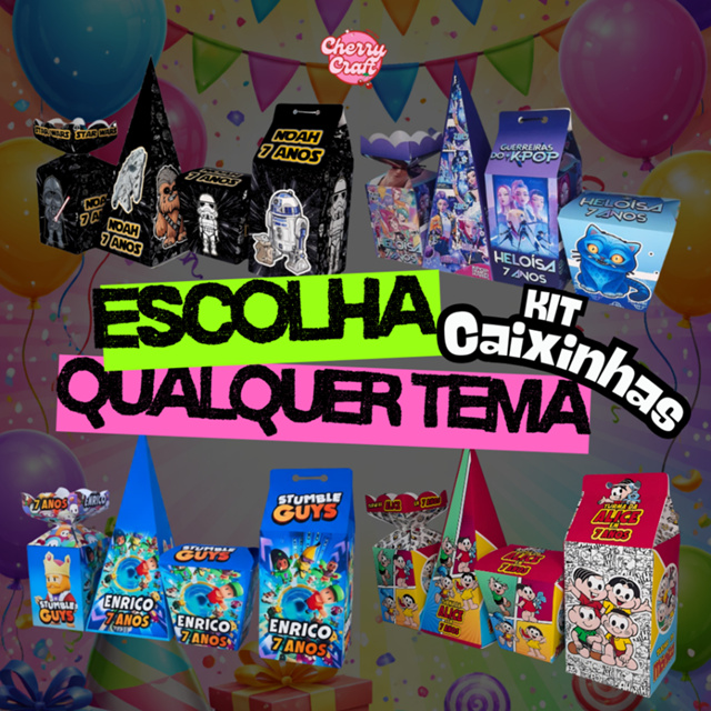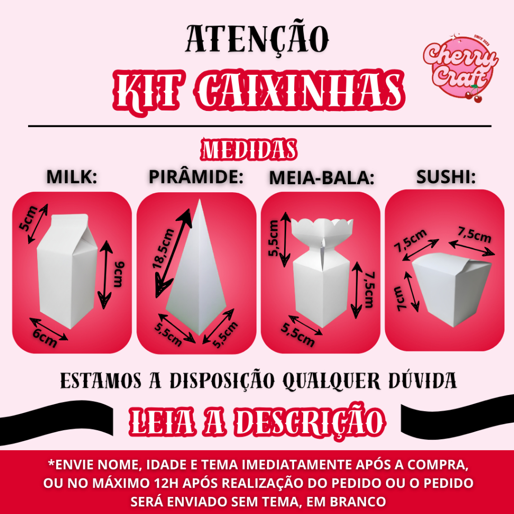 Bem-vindo à CherryCraft ❤ ✨ Personalize e Encante! ✨ Transforme seu evento em algo inesquecível com nossas caixinhas exclusivas e personalizadas! Feitas com papel brilhantes de alta resolução (180g), elas garantem cores vibrantes, detalhes impecáveis e um toque especial para qualquer ocasião. 🟢O kit acompanha os 4 formatos ou se preferir um formato apenas, e são enviados de forma sortida com uma divisão entre as quantidades bem próxima. Confira as medidas de cada formato: Medidas 🥰: - Caixinha Milk: 14cm de altura x6 cm de largura (cada lado) - ESPAÇO ÚTIL: 9cm de altura x 6cm de largura (cada lado) - Caixinha Meia Bala: 13cm de altura x 5,5cm de largura (cada lado) - 7,5cm de altura x 5,5cm de largura (cada lado) - Cone/Pirâmide: 18,5cm de altura x 5,5cm de largura *na parte inferior (cada lado) - Caixinha Sushi: 7cm de altura x 7,5cm de largura *na parte superior (cada Lado) NOSSAS MEDIDAS SÃO PADRÕES, NÃO TRABALHAMOS COM OUTROS FORMATOS OU MEDIDAS. 🟢 Nas imagens do anúncio, há uma ilustração com as medidas de cada formato para uma melhor conferência. Verifique-as com atenção antes de finalizar a compra! Lembre-se de conferir as medidas antes de finalizar a compra para garantir o melhor aproveitamento! 🚨 -ATENÇÃO IMPORTANTE!- Dados de Personalização 🚨 Para garantir que suas caixinhas sejam entregues exatamente como você imaginou: 👉 Envie o nome, idade, tema e outros dados de personalização (com a frase de sua preferência) no momento da compra ou em até NO MÁXIMO 12H horas após realização da compra. ⚠️ Se os dados não forem enviados nesse prazo, faremos o envio do pedido sem personalização, EM BRANCO seguindo o prazo de postagem da shopee. ⛔ Evite problemas e garanta a sua personalização! ✨ Como Comprar: 1️⃣ Entre em contato pelo chat da Shopee ou coloque diretamente nas OBSERVAÇÕES DO PEDIDO. 2️⃣ Envie os dados de personalização: nome e idade, tema ou frase de sua preferência. 3️⃣ Aprove a arte no chat o mais rápido possível. Confirmando seu pedido ele já vai para produção e envio — prepare-se para surpreender! 🎈 Características Especiais: 📦 Papel Fotográfico Brilhante Premium (180g): Toque sofisticado e acabamento de alta qualidade. 🎨 Impressão em Alta Resolução e com CORES + VIBRANTES: CORES VÍVIDAS que fazem a diferença. ✏️ Nome e Tema Personalizado: Um toque único para tornar o seu evento memorável. 🛠️ Fácil Montagem: Enviado desmontado para maior praticidade e com QR CODE com tutorial de montagem. NÃO acompanha cola NEM FITA DECORATIVA. ❌As caixinhas não são de papelão!! São de papel de alta qualidade gramatura 180g, caixinhas simples, práticas para deixar sua festa mais linda com o melhor custo-benefício!! ⚠️IMPORTANTE: Os formatos MILK e MEIA BALA precisam de fita para fazer o fechamento e finalização, qualquer dúvida sobre as medidas para compra estamos a disposição!! Ideal para aniversários, casamentos, chás de bebê e muito mais. Surpreenda seus convidados com lembrancinhas feitas para encantar. 🌟 Faça seu pedido agora e transforme seu evento em uma experiência inesquecível! 🌟