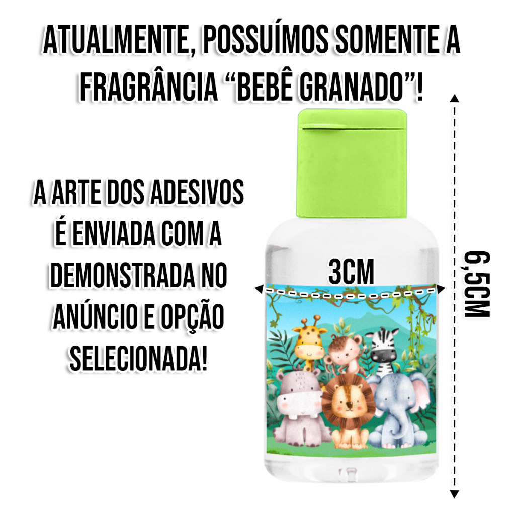 Seja bem vindo à nossa loja! ATENÇÃO A QUANTIDADE DO KIT É ENVIADA DE ACORDO COM O SELECIONADO EM SUA RESPECTIVA OPÇÃO. Selecionando "30 Unidades" enviamos 30 unidades respectivamente! Procurando uma forma especial de agradar seus convidados? Apresentamos a você nossa incrível seleção de lembrancinhas, perfeitas para mamães e papais que procuram um bom presente para seus convidados nesses principais momentos da vida de seus filhos. Sabemos que as primeiras memórias são extremamente importantes para as novas famílias e ao escolher nossas lembrancinhas, você estará transmitindo o cuidado e todo o amor e carinho que seus convidados precisam. Nos comprometemos com um envio rápido e seguro para todo o Brasil, visando tentar atender a todas as necessidades que você precisa e no tempo que precisa. ITENS INCLUSOS: - Frascos de 30ml com Sabonete Líquido Transparente (aroma "Bebê Granado") e Tampas Coloridas (de acordo com a opção selecionada); - Etiquetas Adesivas Tema Safari (de acordo com a opção selecionada); - Tags Furadas Tema Safari (de acordo com a opção selecionada); - Saquinhos Plástico e Fitilhos Plásticos. -------------------------------------------------------------- POR QUE COMPRAR CONOSCO? 1º - Temos preocupação com a integridade do kit: Enviamos todos os itens separadamente no pacote, garantindo a integridade do produto durante a entrega. Dessa forma, assim que o kit estiver em suas mãos, você poderá montá-lo tranquilamente e garantir que seus convidados sejam presenteados com qualidade. 2º - Produto de excelente qualidade: Nosso sabonete é formulado com ação antibacteriana capaz de eliminar até 99,99% das bacterias e germes, fornecendo a proteção que seus convidados precisam. Além disso, possuem textura leve e oferecem o toque suave de uma fragrância delicada, deixando uma lembrança duradoura em seus convidados. A fragrância 'Bebê Granado' rende uma experiência olfativa única e encantadora capaz de agradar qualquer pessoa. 3º - Adesivos e Tags temáticos exclusivos: Acompanhando os sabonetes, oferecemos adesivos e tags temáticos para encantar seus convidados. Seja para comemorações especiais, chá de bebê, chá de fraldas, visita maternidade ou até mesmo para mesversários, gostaríamos de participar com você de todos os momentos e nossos adesivos acrescentam um toque de charme e personalidade as suas lembrancinhas. Este anúncio não acompanha o serviço de personalização das artes do adesivo, mas caso queira um produto com arte personalizada ou para uma ocasião diferente, envie-nos uma pergunta logo abaixo solicitando o anúncio que precisa. Nossa equipe enviará o anúncio correto para você. Caso efetue a compra nesse anúncio deveremos enviar somente com a arte selecionada. 4º - Saquinhos e Fitilhos: Com eles, você poderá embalar suas lembrancinhas de forma prática e sofisticada, tornando a entrega ainda mais especial e elegante. 5º - Sua satisfação garantida: Além de oferecer produtos de alta qualidade, nos comprometemos a proporcionar um atendimento excepcional. Nossa equipe está pronta para auxiliá-lo(a) em todas as etapas e, em caso de dúvidas, pode entrar em contato conosco antes de realizar sua compra. -------------------------------------------------------------- ESPECIFICAÇÕES TÉCNICAS: FRASCO SABONETE LÍQUIDO: - Dimensões (A x L): 6,5cm x 3cm; - Volume: 30ml; - Tampa Fliptop: de acordo com a opção selecionada; - Conteúdo: Sabonete Líquido Incolor; - Aroma: 'Bebê Granado'. ETIQUETA ADESIVA TEMÁTICA: - Dimensões (A x L): 3,2cm x 3,2cm; - Material: Papel Adesivo. TAG TEMÁTICA: - Dimensões (A x L): 3,5cm x 4,5cm; - Material: Papel Couche Fosco.