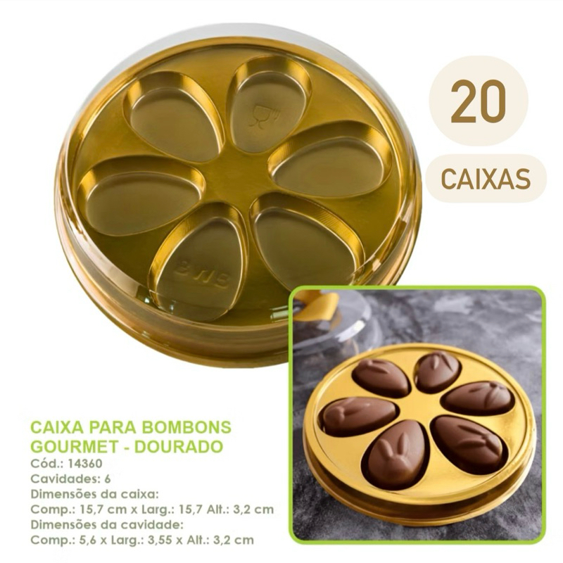 10~40 Caixa Para Bombons Gourmet Dourado BWB Cód.: 14360 - Embalagem Para Páscoa 2025 OFF CAIXA PARA BOMBONS GOURMET - DOURADO Cód.: 14360 Cavidades: 6 Dimensões da caixa: Comp.: 15,7 cm x Larg.: 15,7 Alt.: 3,2 cm Dimensões da cavidade: Comp.: 5,6 x Larg.: 3,55 x Alt.: 3,2 cm