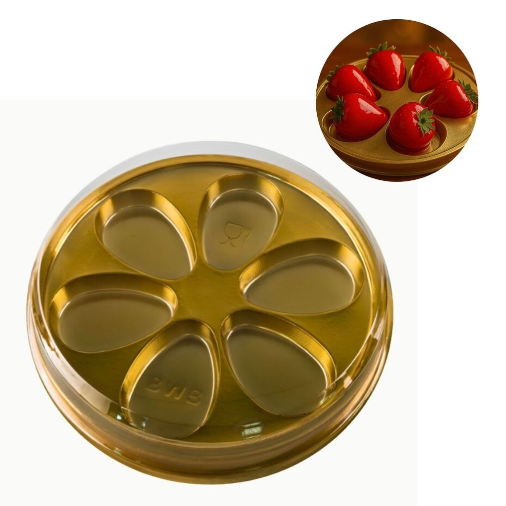 CAIXA P/ 6 BOMBONS GOURMET COR: DOURADO CONTÉM 10 UNIDADES MARACA: BWB Cavidades: 6 Unidades pacote: 10 Comp.: 15,7 mm x Larg.: 15,7 mm x Alt.: 3,2 mm
