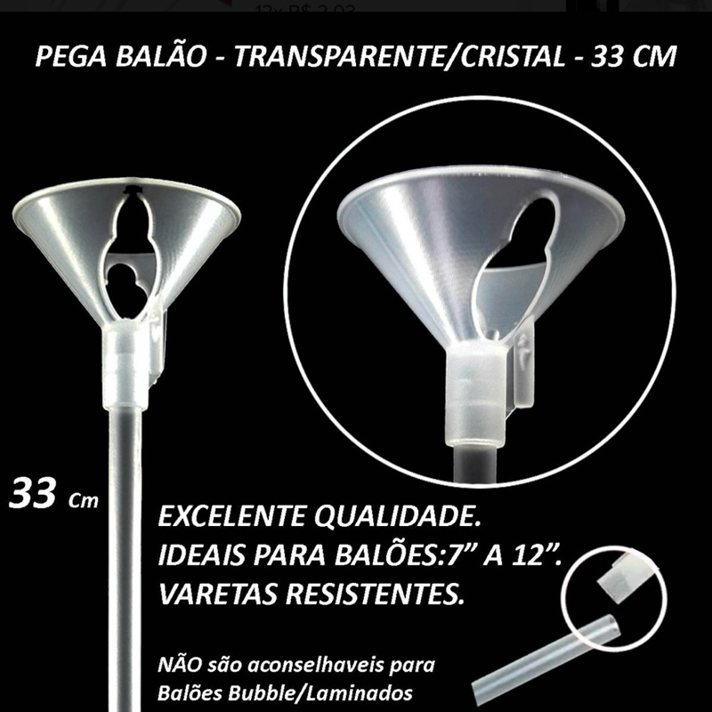 SUPORTE PARA BALÃO 32cm - PEGA BALÃO / VARETA / HASTES . QUANTIDADE NO TÍTULO DO ANÚNCIO - DISPONÍVEL APENAS NA COR CRISTAL CADA PACOTE CONTÉM 10 . HASTE DE PLÁSTICO E SUPORTE NA EXTREMIDADE. CADA VARETA POSSUI SUPORTE PARA 1 BALÃO . CARACTERÍSTICA: - VARETA EM PLÁSTICO RESISTENTE COM SUPORTE. DIMENSÕES (mm): DIÂM.: 36 x ALT.: 32 MATERIAL: PET COMO POSSO USAR? - USE PARA FIXAR EM POSIÇÃO VERTICAL BALÕES MONTANDO ASSIM UMA LINDA DECORAÇÃO. - USE COMO LEMBRANCINHA COM BALÕES DECORATIVOS, PERSONALIZADOS OU METALIZADOS. ** NÃO ACOMPANHA A BEXIGA, IMAGEM MERAMENTE ILUSTRATIVA **