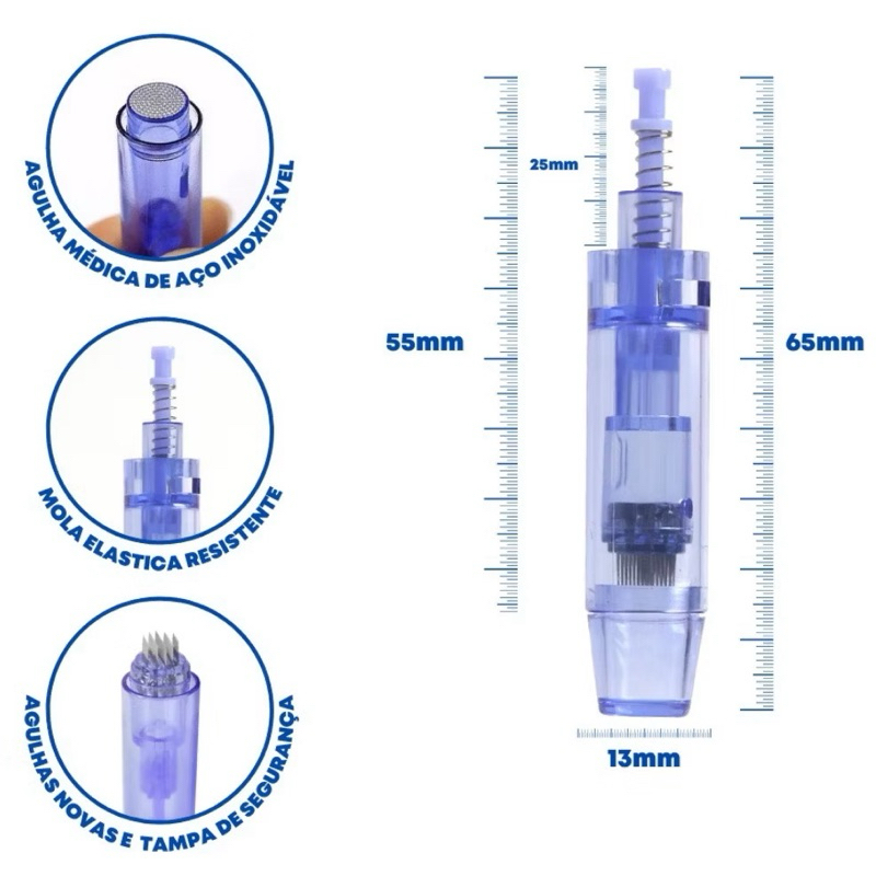 Indicações - Permeação de cosméticos - Renovação celular - Rejuvenescimento - Sequelas pós acne, pós queimadura entre outras - Estrias - Flacidez de pele - Discromias - Alopecia (Calvície) - Celulite e Gordura localizada Contraindicações - Acne Ativa - Gravidez e lactação - Neoplasias benignas e malignas - Doenças imunodepressoras -Afecções de pele - Cicatrizes de queloides - Dermatoses inflamatórias, rosácea e outras - Anticoagulantes (Relativo) - Corticoterapia crônica ou aguda - Diabetes (Relativo) Modalidades de Ação 1-Drug Delivery System Permeação de princípios ativos de forma facilitada. 2- Indução Percutânea de Colágeno Ativação da cascata inflamatória natural para a formação de novas fibras de colágeno e elastina (neocolanogênese) e capilares sanguíneos (angiogênese) resultando na formação de um novo tecido. Terapia de Indução de Colágeno - Microagulhamento Estético O microagulhamento estético, denominado de Indução Percutânea de Colágeno é um procedimento direcionado para o público profissional capacitado para atuar com a técnica. De perfil minimamente invasivo, gera múltiplas micro perfurações na superfície da pele que facilitam a permeação de princípios ativos, como também, promove um estímulo na produção de colágeno e elastina através da regeneração da pele. Precauções e Orientações - Equipamento de uso profissional, exige capacitação e treinamento. - Proibido sua reutilização e descarte em lixo comum. - Uso único, totalmente exclusivo e proibido o reuso do equipamento. - Higienizar corretamente a pele do paciente antes da aplicação. - Aguardar 12 a 24 horas para o uso do protetor solar. - Indicado bloqueio anestésico tópico para agulhas que não ultrapassem 1,0 mm de comprimento. (Conforme sensibilidade e tolerância) - Indicação e escolha correta para o procedimento indicado. Associação de Cosméticos -Formulação base aquosa (géis, séruns, gel-creme, fluidos). Associar os dermocosméticos conforme a indicação estabelecida para o tratamento. Podendo ser Vitamina A e C, Fatores de crescimento e seus peptídeos, Ácido hialurônico (ativos hidratantes),Clareadores, Anti Envelhecimento e Estimulantes do crescimento capilar. Com 10 unidades Número Anvisa 81917739002