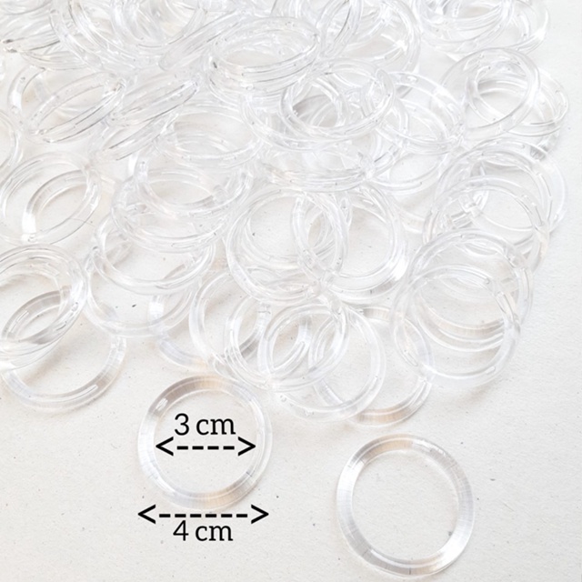Argola plástica de acrílico 30A transparente para porta guardanapo, pode ser usada em cortinas, toalhas, capa para caixa acoplada em crochê e muito mais. Use sua criatividade com essa peça linda! 10 unidades Composição: Plástico. Diâmetro externo: 40mm. Diâmetro interno: 30mm. Espessura: 4mm. A Argola Ritas é internacionalmente conhecida por sua alta qualidade e versatilidade, podendo ser usada tanto no mercado da confecção, como para o artesanato.