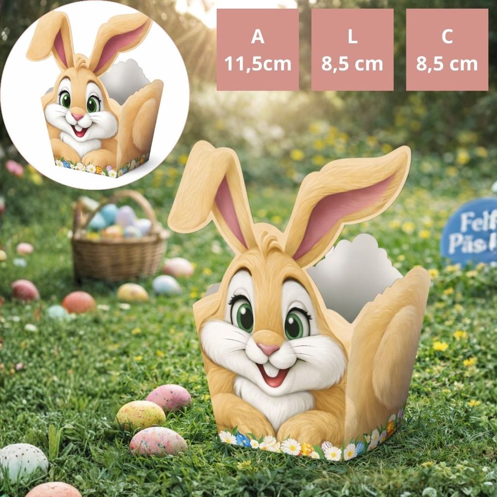 CACHEPO COELHO DE PÁSCOA BEGE PERFEITO PARA PRESENTAR MATERIAL: PAPEL CARTÃO MEDIDAS COMPRIMENTO: 8,5cm LARGURA: 8,5cm ALTURA: 11,5cm