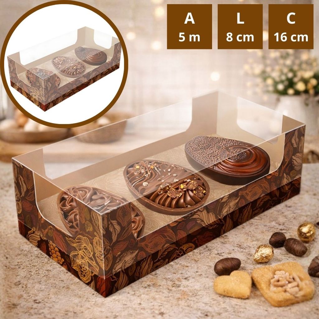 CAIXA MINI OVOS ENCANTO 3X50G CÓD. 5919 * PT PARA 03 OVOS DE 50G TAMPA DE ACETATO DESCRIÇÃO A CAIXA MINI OVOS ENCANTO 3X50G DA LINHA PURO CACAU É ELEGANTE E FUNCIONAL. COM DESIGN CLEAN E ESTRUTURA FIRME, VALORIZA PEQUENOS CHOCOLATES E DOCES GOURMET. MEDIDAS CM (CXLXA) 16X8X5 MATERIAL PAPEL, TINTA E PLÁSTICO SUGESTÕES DE USO IDEAL PARA MINI OVOS, TRUFAS, BOMBONS E LEMBRANÇAS PERSONALIZADAS. DIFERENCIAIS ESTRUTURA FIRME E DURÁVEL; DESIGN SOFISTICADO; IDEAL PARA MINI OVOS E DOCES FINOS.