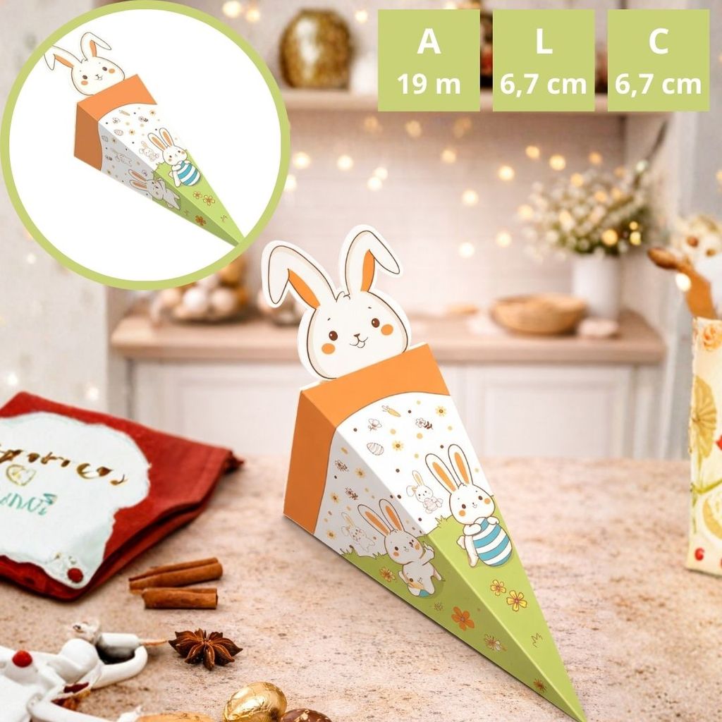 CONE COELHO CÓD. 5947 * PT DESCRIÇÃO O CONE COELHO DA LINHA PÁSCOA COLORIR É LÚDICO E ENCANTADOR. COM FECHO EM FORMATO DE COELHO, TORNA O PRESENTE DIVERTIDO E CRIATIVO. MEDIDAS CM (CXLXA) 6,7×6,7×19 MATERIAL PAPEL E TINTA SUGESTÕES DE USO IDEAL PARA CONES TRUFADOS, DOCES, BALAS, CHOCOLATES, BOMBONS OU PIPOCA GOURMET.” DIFERENCIAIS FORMATO TEMÁTICO; ESTRUTURA FIRME E FÁCIL DE MONTAR; DESIGN EXCLUSIVO E INFANTIL.