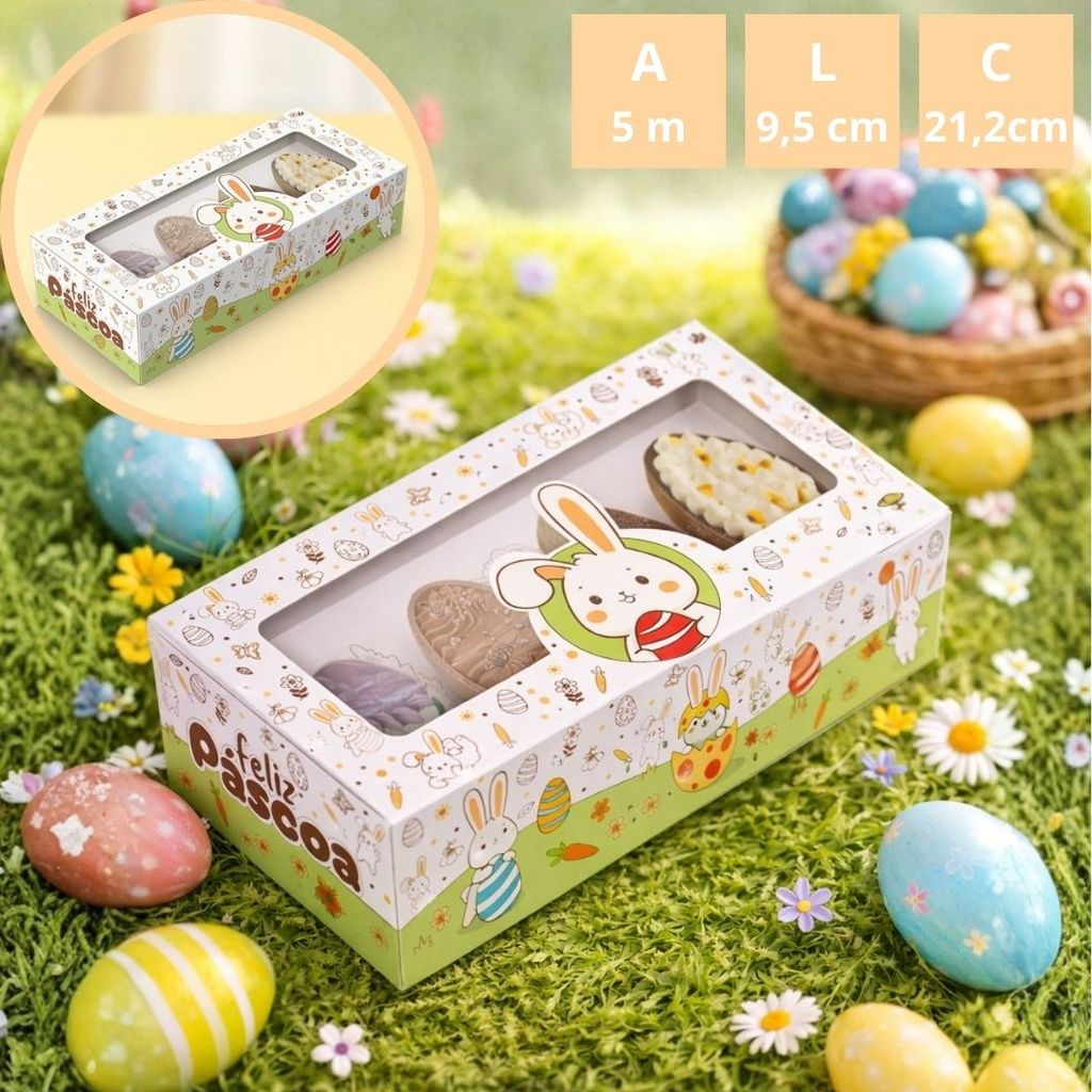 CAIXA GAVETA PARA 4 MINI OVOS 50G OU COELHO DE CHOCOLATE CÓD. 5918 * PT BERÇO DUPLO: PARA 04 MINI OVOS DE 50G OU COELHO DE CHOCOLATE COM VISOR DE ACETATO PARA 04 OVOS DE 50G DESCRIÇÃO A CAIXA GAVETA 4 MINI OVOS DA LINHA PÁSCOA COLORIR UNE CRIATIVIDADE E VERSATILIDADE. COM ILUSTRAÇÕES PARA PINTAR E VISOR TRANSPARENTE, É IDEAL PARA PRESENTES PERSONALIZADOS. O PRODUTO ACOMPANHA UM BERÇO VERSÁTIL, QUE PERMITE ESCOLHER ENTRE DUAS OPÇÕES DE MONTAGEM: ACOMODAR QUATRO MINI OVOS DE 50G OU UM COELHO DE CHOCOLATE, PERFEITO PARA A FORMA BWB 10610. BASTA ESCOLHER A FORMA QUE MELHOR COMBINA COM SUA PRODUÇÃO. MEDIDAS CM (CXLXA) 21,2×9,5×5 MATERIAL PAPEL, TINTA E PLÁSTICO SUGESTÕES DE USO PERFEITA PARA MINI OVOS, COELHOS DE CHOCOLATE, MINI SABONETES, VELAS OU PRODUTOS ARTESANAIS. COMPLEMENTE COM CANETINHAS, GIZ E LÁPIS DE COR. DIFERENCIAIS ILUSTRAÇÃO TEMÁTICA PARA COLORIR; VISOR TRANSPARENTE E ESTRUTURA FIRME; DESIGN FUNCIONAL E DIVERTIDO.