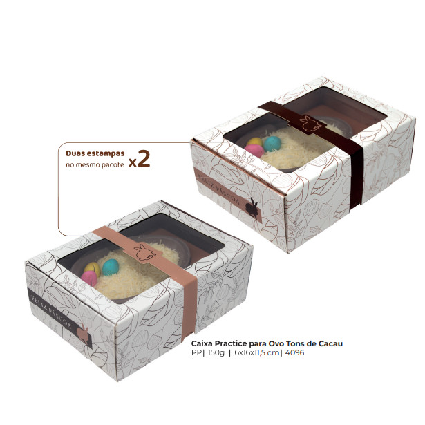 Caixa Practice para Ovo Tons de CacauPáscoa CHOCOBRAZTamanho da embalagem montada: PP - 150G - 6x16x11,5 cm Lindas embalagens de PÁSCOA para impulsionar suas vendas. Confeccionada em papel triplx Premium. As caixas possuem um designe único e de fácil montagem, que pode ser utilizadas para embalagem de ovos de páscoa, doces e chocolatesATENÇÃO:- Quantidade no título do anúncio- Não inclui ovos de chocolate, doces e chocolate (apenas embalagem)- Não personalizamos, cores e temas apenas como esta na foto.- Confira o prazo de envio no ato da compra- A caixa é enviada desmontada para a preservação do produto e otimização e de custo de freteConfira toda a nossa linha de produtos clicando em "VER MAIS PRODUTO DESSE VENDEDOR"BRAZ