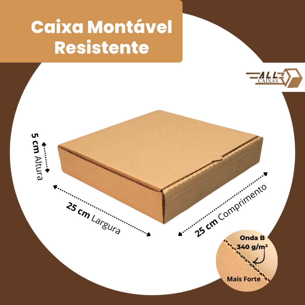 - 25 (cm) x 25 (cm) x 5 (cm) – Comprimento x Largura x Altura. - O kit contém 10 unidades de caixa. - Embalagens resistentes e práticas. - Papelão ondulado de alta qualidade (Onda B). - Ótimo para Delivery de Salgados e Doces. - Correios, Sedex, PAC ou outras transportadoras. - Fácil de montar. Caixas de Papelão – 25x25x5 Procurando uma solução segura e econômica para embalar seus produtos para envio? As nossas caixas de papelão são a escolha ideal para quem precisa de embalagens resistentes e práticas, com um excelente custo-benefício. Feitas de papelão ondulado de alta qualidade (Onda B), nossas caixas são muito resistentes e oferecem a proteção necessária para garantir que seus produtos cheguem intactos ao destino. Perfeitas para o envio de encomendas de Salgados, Doces e envios por Correios, Sedex, PAC ou outras transportadoras. Principais Características: Material de alta qualidade: Papelão ondulado Onda B, que proporciona maior resistência e durabilidade. Fácil de montar: Design que facilita a montagem, tornando o processo rápido e seguro. Economia no envio: O design foi otimizado para garantir o melhor peso cúbico, reduzindo os custos com frete. Ideal para: - Delivery de Salgados e Doces. - Vendedores de marketplaces. - Envio de produtos em geral, com segurança e economia. Observação: As caixas são enviadas desmontadas, o que facilita o armazenamento. A montagem é simples e rápida. Especificações do Produto: Tamanho: 25x25x5 cm Material: Papelão ondulado Onda B (resistente) Cor: Parda Modelo: Montável (convencional) Gramatura: 340 g/m² Importante: Para selar as caixas, é necessário utilizar fita adesiva. Entre em contato conosco para mais informações ou para tirar dúvidas. Estamos aqui para ajudar!