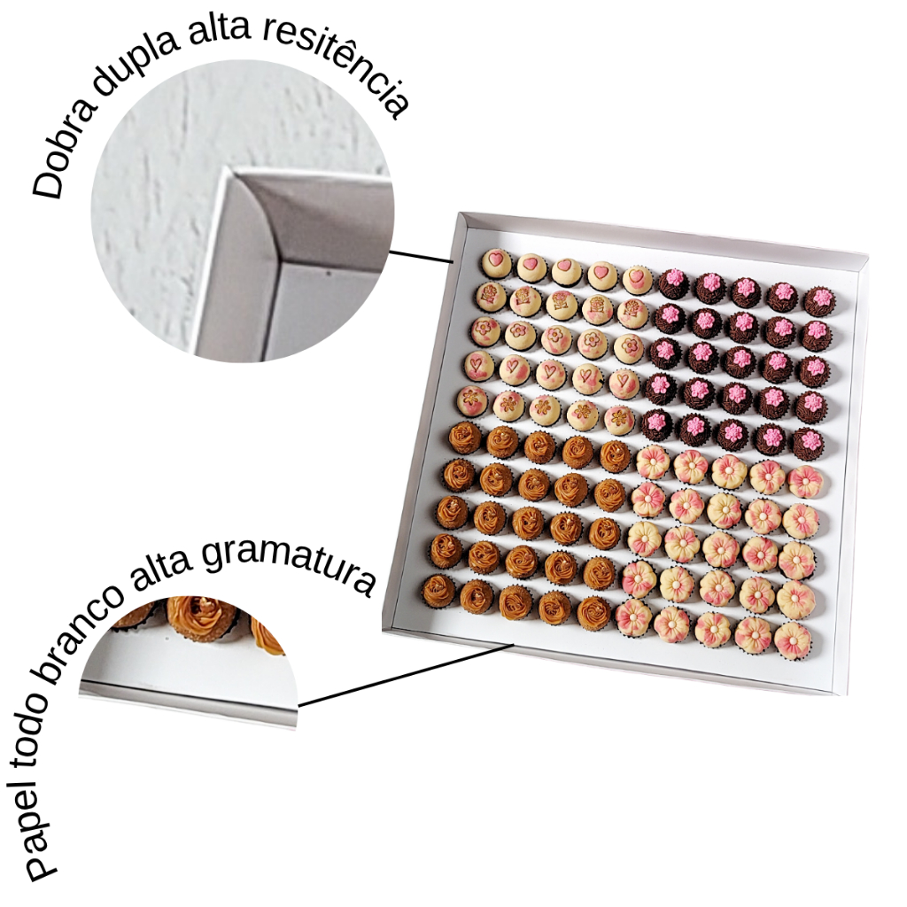 Produto - 10 Caixas com berço para 100 brigadeiros Branca - Altura 5,5cm Transforme a apresentação dos seus brigadeiros com nossas caixas de alta qualidade! No pacote você irá encontrar: - Bases da caixa - Tampas da caixa - Berços com 100 cavidades para brigadeiros A altura ideal para decorar seus brigadeiros sem medo de amassar suas pitangas! Cada caixa é enviada desmontada, facilitando o transporte e a organização. Para aprender a montar, acesse e confira o vídeo que preparamos especialmente para você. A montagem é simples e feita por encaixe, sem necessidade de cola! Material da caixa Cartão com duplo revestimento: alta espessura, alta rigidez e alta alvura. Base e berço: Papel Cartão Duplex 290g (Papel Premium com certificação FSC). Tampa de Papel: Papel Cartão Duplex 260g (Papel Premium com certificação FSC). Cor: kraft. Dimensões do produto Altura: 5,5 cm Largura: 40 cm Comprimento: 40 cm Escolha o berço de acordo com o tamanho dos seus brigadeiros: - Cavidade de 2,9 cm para brigadeiros entre 14g a 20g. - Cavidade de 3,2 cm para brigadeiros entre 20g a 27g. Atenção: Esta caixa requer cuidado na entrega, por isso, não recomendamos entregas por motos. Dica: Doces, fitas ou qualquer item utilizado nas imagens não acompanham as caixas, mas você pode personalizar da sua maneira! Não perca a chance de encantar seus clientes e amigos com uma apresentação impecável!