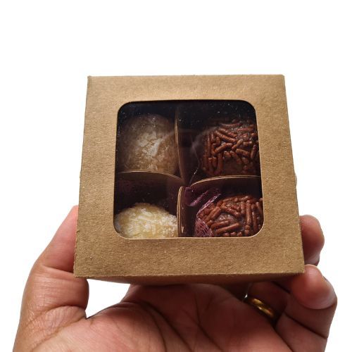 10+ Caixas KRAFT 4 doces com visor 7,5x7,5x3cm.