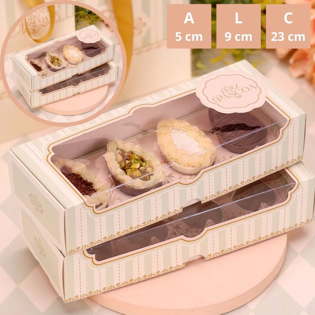 DESCRIÇÃO DO PRODUTO ESPECIFICAÇÕES TÉCNICAS: *ATENÇÃO AOS PRAZOS DE ENTREGA* RECOMENDAMOS SEMPRE CONSIDERAR O PRAZO DAS TRANSPORTADORA AO PROGRAMAR SUA PRODUÇÃO, PRINCIPALMENTE EM PERÍODOS DE ALTA DEMANDA. ALTURA: 5 CM LARGURA: 9 CM COMPRIMENTO: 23 CM OBSERVAÇÕES: IMPORTANTE ATENTAR-SE AOS PRAZOS DAS TRANSPORTADORAS; IDEAL PARA 4 MINI OVOS DE 50G; SERVIRÁ NA SACOLA 26X16,5X13 CM OU A SACOLA GRANDE; A CAIXA VAI DESMONTADA PARA FACILITAR O ENVIO E O VALOR DO FRETE; AS IMAGENS SÃO ILUSTRATIVAS PARA DEMONSTRAÇÃO DO PRODUTO, NÃO ACOMPANHAM DOCES; SE HOUVER DÚVIDAS NA MONTAGEM, ENTRAR EM CONTATO COM O ATENDIMENTO VIA WHATS*APP. CARACTERÍSTICAS: TABELA DE MEDIDAS ALTURA - 5 CM LARGURA - 9 CM COMPRIMENTO - 23 CM ORIENTAÇÃO DE USO QUAL SACOLA CABE ESSA EMBALAGEM? SACOLA GRANDE SACOLA HORIZONTAL