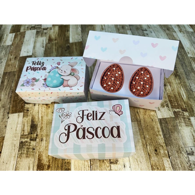 Lindas caixas feita em papel offset 240 G/Cm³ Berço em papel offset 240 G/Cm³ Todos os modelos Acompanham os berços PRODUTO VAZIO Cabe 2 ovos de colher de 50 g no berço cada Medidas: comprimento x largura x altura Medida Da Caixa Montada: 12 x 8 x 4 cm. Enviamos com recorte e vinco fácil de montar As caixas são enviadas desmontadas para garntir a qualidade do produto no processo logistíco.