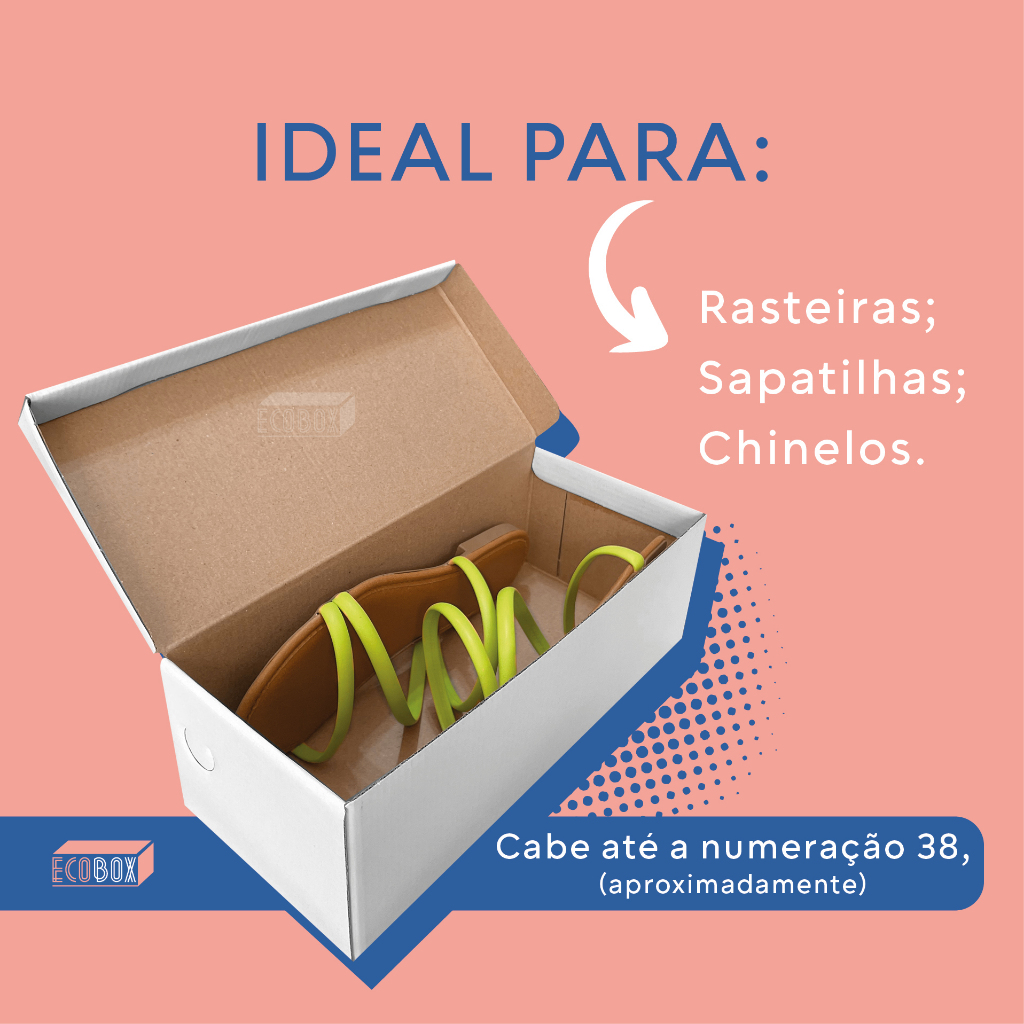 10 unidades à pronta entrega. Caixa de sapato ecologicamente sustentável em papelão, com ótima qualidade e resistência, perfeita para rasteirinhas, chinelos, sapatos pequenos e, até mesmo para envio de pequenos produtos por e-commerce ou delivery. Medidas · Comprimento: 28cm · Largura: 12cm · Altura: 9,5cm Cor: Branca sem impressão. Material: Fosco acoplado em micro ondulado. As caixas são enviadas desmontadas, porém já possuem cola nos locais corretos para uma montagem super rápida e fácil. TEMOS VÁRIOS MODELOS / TAMANHOS DISPONÍVEIS À PRONTA ENTREGA!