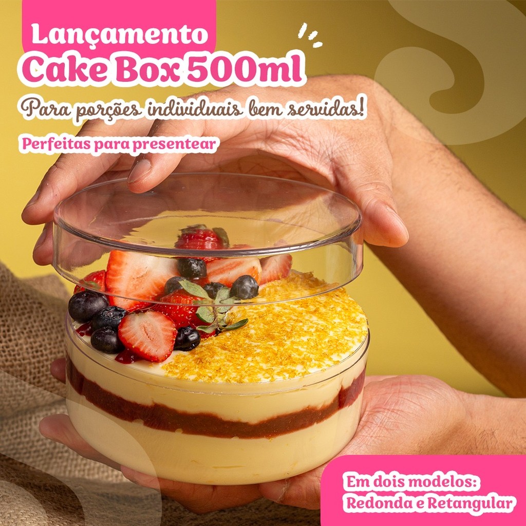 Cake Box Cristal REDONDA 500ml Perfeitas para evidenciar as camadas dos doces! Resistente - feita em poliestireno cristal (mais durável do que acrílico!) Transparente - Assim seu cliente pode ver tudo o que tem nessa caixinha perfeita Os dois modelos têm capacidade para 500ML de doce, servindo porções generosas Possibilita decorações em cima, devido à transparência da tampa - aproveite para personalizar! Excelente para delivery - envie doces para seus clientes com mais tranquilidade, sabendo que o doce terá mais estabilidade no transporte. Tamanho: 7 x 12,8cm com tampa Quantidade de peças: 02 (Caixa e Tampa)