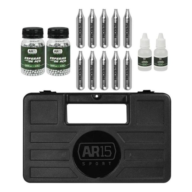 Produto de uso exclusivo em práticas esportivas. O uso do produto exige treinamento e equilíbrio emocional. Deverá ser guardado em lugar seguro e fora do alcance de terceiros. Os produtos aqui listados servem apenas para uso recreativo, ou seja ***NÃO*** letal. ESPECIFICAÇÕES TÉCNICAS DA MALETA: - Marca: Ar15 Sport - Material: Polímero - Formato: Case Maleta - Cor principal: Preta - Alça de mão fixa e rígida - Orifício para comportar um cadeado - Parte interna com espuma tipo casca de ovo - Espessura x largura x comprimento: 5,5cm x 18cm x 29cm - Peso total: 310 gramas ESPECIFICAÇÕES TÉCNICAS DA ESFERA: - Marca: Ar15 Sport - Material: Aço - Formato: Esférico - Calibre: 4.5mm (.177) - Quantidade: 1.000 unidades - Aplicação: Armas de cano sem raias - Diâmetro x altura da garrafa: 4cm x 8,1cm ESPECIFICAÇÕES TÉCNICAS DO CO2: - Marca: Rossi - Conteúdo: Gás Co2 - Peso: 12 gramas - Encaixe: 3/8" - Não possui rosca - Não reutilizável (descartável) - Diâmetro do cilindro: 1,8cm - Comprimento do cilindro: 8,2cm - Peso bruto: 42 gramas ESPECIFICAÇÕES TÉCNICAS DO ÓLEO: - Marca: Ar15 Sport - Quantidade: 15ml - Composição: 100% Silicone - Diâmetro x comprimento da embalagem: 26,3mm x 70,6mm - Peso da embalagem: 22 gramas ITENS INCLUSOS: - 01 Maleta Case Rígida Ar15 Sport Preta 29cm - 10 Cilindros de Co2 Rossi Sem Rosca 12g (cada) - 02 Óleos de Silicone Ar15 Sport 15ml (cada) - 02 Garrafas de Esferas de Aço Ar15 Sport 4.5mm 1000un. (cada) INFORMAÇÃO: Os equipamentos, peças e acessórios aqui listados são de uso exclusivo em armas de pressão (gás comprimido ou mola), airsoft, paintball, esferas plásticas (BBS) e estão em conformidade com a legislação brasileira de USO PERMITIDO "É permitido o uso de armas de pressão por ação de gás comprimido ou por ação de mola, com calibre igual ou inferior a seis milímetros (6mm ou 6.0mm), e das que lançam esferas de plástico com tinta, como os lançadores de paintball." Conforme parágrafo único do Art. 11 do DECRETO Nº 11.615, DE 21 DE JULHO DE 2023. A venda desses itens é feita somente para maiores de 18 anos mediante a comprovação de maior idade. Atenção: O envio de Armas de pressão e Airsoft é realizado somente por transportadora. Caso tenham dúvidas entrar em contato.