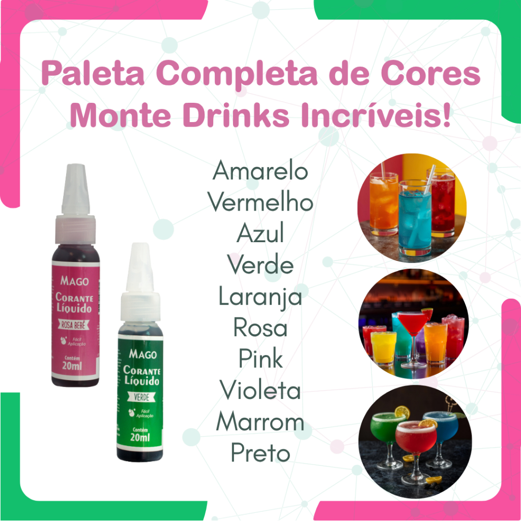 Corante Liquido Mago 20 ml - 10 Cores Estes são os incríveis Corantes Mago para decoração de Drinks e bebidas! Use-os Para colorir preparações, com incríveis detalhes e assim deixar seu preparo diferenciado e com toque personalizado! ONDE PODE SER UTILIZADO? Pode ser usado em massas, bebidas, coberturas, tortas, biscoitos, doces, glace, glace real. QUAIS AS CORES DO KIT? Preto, verde, azul, laranja, amarelo, rosa, pink,marrom, vermelho e violeta! (o kit acompanha uma cor de cada) Ingredientes: água, Propilenoglicol, Corantes Artificiais Contém glúten e Amarelo Tartrazina COMO DEVE SER ARMAZENADO? Em local fresco e seco, ao abrigo de luz, calor e umidade. CONTEÚDO DO ANÚNCIO: 01 UNIDADE DE CADA COR (TOTAL 10 BISNAGAS DE CORANTE LÍQUIDO) Te aguardamos após a compra! Equipe Armarinhos A10!
