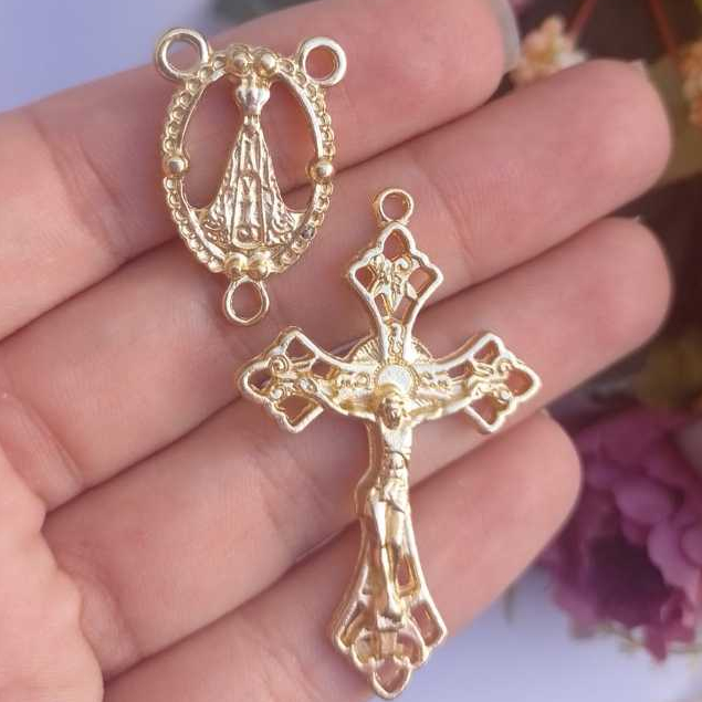 10 Crucifixos + 10 Entremeios para Terços Nossa Senhora Aparecida Dourado - kit para Montagem de Terços - Terços Nossa Senhora