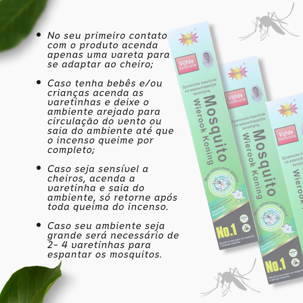 O incenso é um produto desenvolvido com ingredientes naturais que ajuda a repelir e afastar mosquitos. Ele cria uma barreira protetora ao redor do ambiente, garantindo noites de sono tranquilas e sem picadas. As varetas foram refinadas na nova tecnologia moderna; fácil de queimar e bastante estável, aroma elegante, seguro para usar perto de pessoas e animais de estimação. Aplicável a: hotéis, restaurantes, sala de estar, fazenda.etc. QUAL FRAGÂNCIA? Aroma natural de Osmanthus e ervas naturais. COMO FUNCIONA? O incenso mata mosquito atua de forma eficaz para repelir os mosquitos. Seu mecanismo de ação é baseado na liberação de substâncias naturais no ar, que interferem nos sentidos dos insetos, evitando que se aproximem. Além disso, o efeito repelente se mantém por um longo período de tempo (2-4 Horas), mantendo sua casa livre de mosquitos e outros insetos incômodos. GARANTIA DE QUALIDADE O incenso mata mosquito é um produto certificado, com selos de qualidade que comprovam sua eficácia e segurança. Além disso, em caso de contratempos com envio oferecemos uma política de reembolso conforme regras da plataforma para que você possa comprar com tranquilidade e confiança. PERGUNTAS FREQUENTES: Qual é a duração de cada incenso? A duração de cada incenso varia, mas em média dura aproximadamente 4 horas. Durante esse tempo, o efeito repelente se mantém ativo. Como devo armazenar o incenso mata mosquito? É recomendado armazenar o incenso em local fresco, seco e protegido da umidade. Assim, você garantirá a eficácia e durabilidade do produto. O incenso mata mosquito pode ser usado em ambientes fechados? Não, o incenso tem potencial para criar uma barreira protetora contra mosquitos, mantendo o espaço livre desses insetos indesejados, desta forma é preferível que o ambiente seja arejado para uma boa troca de ar.
