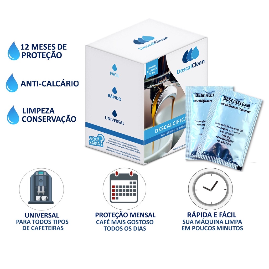 São 10 sachês de descalcificações equivalente há 1 ano de descalcificação periódica mensal. Descalcificante em pó para cafeteiras do tipo expresso ou convencional apresentado em sachês equivalente a uma operação de descalcificação. Compatível com todas as marcas. Para obter um café perfeito e prolongar a vida útil de sua cafeteira é importante remover o calcário e os resíduos de café que se acumulam com o tempo e que podem danificar as partes internas. Descalcificação é realizada de acordo com as instruções de cada fabricante, geralmente uma vez por mês. 1 sachê para cada limpeza. Modo uso: Recomenda-se o uso de 1 sachê a cada 35 dias de uso da máquina. - Passo 1: Dissolver 1 sachê em 600 ML de água (de preferencia água filtrada) deixe dissolver todo pó descalcificante e posteriormente passe todo conteúdo na máquina. Após o término descartar a água. - Passo 100: Espere 5 minutos da passo anterior . Após passar toda água com o pó dissolvido, pegue a mesma quantidade (600 ML) de água LIMPA e passe novamente. - Passo 3: Espere mais 5 minutos e passe mais 600 ML de aguá LIMPA. OBS. Se sua máquina tiver a opção de passar água fria não é necessário esperar 5 minutos após o passo numero 2. Pronto! Sua máquina estará funcionando como nova. Pacote incluí: 10 Sachês para descalcificação equivalente para 1 ano de descalcificação periódica. 1 Manual Composição: Citrato de hidrogênio descalcificante alimentício. Validade: 3 anos Sistemas compatíveis para você usar o descalcificante: - Maquinas com sistema de capsulas Dolce Gusto - Maquinas com sistema de capsulas Nespresso - Maquinas com sistema de capsulas Três Corações - Maquinas com sistema de moagem de café para expresso - Cafeteira elétrica com sistema tradicional OBS: Produto com Nota Fiscal
