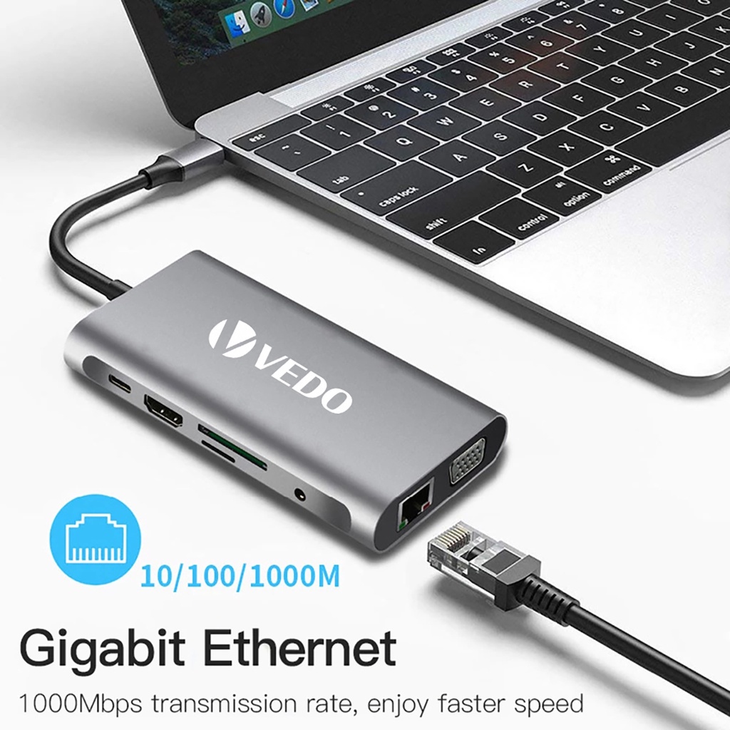 10 em 1 USB C HUB Tipo C Adaptador para HDMI compatível Cartão 4K VGA RJ45 SD/TF 3,5MM AUX 10 Port Docking Station Divisor de PC Portátil