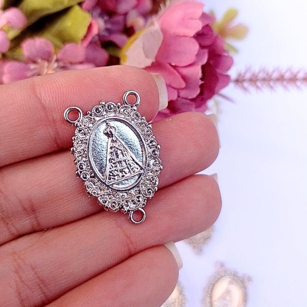 Entremeio para Montagem de Terço Católico. Entremeio para Terço Nossa Senhora Aparecida. Lindo entremeio com Nossa Senhora ao centro, para compor seu terço com delicadeza. Conheça a qualidade da Vermac Artigos Religiosos. - Medidas Altura: 2.7 cm Largura: 1.8 cm Banho: Níquel brilhante - Prateado
