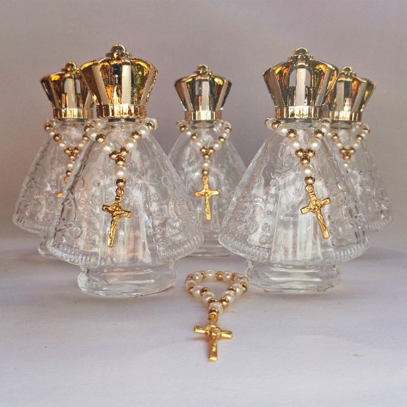 10 Frascos de Vidro Nossa Senhora Aparecida com Mini Terço Lembrancinha para Batizado