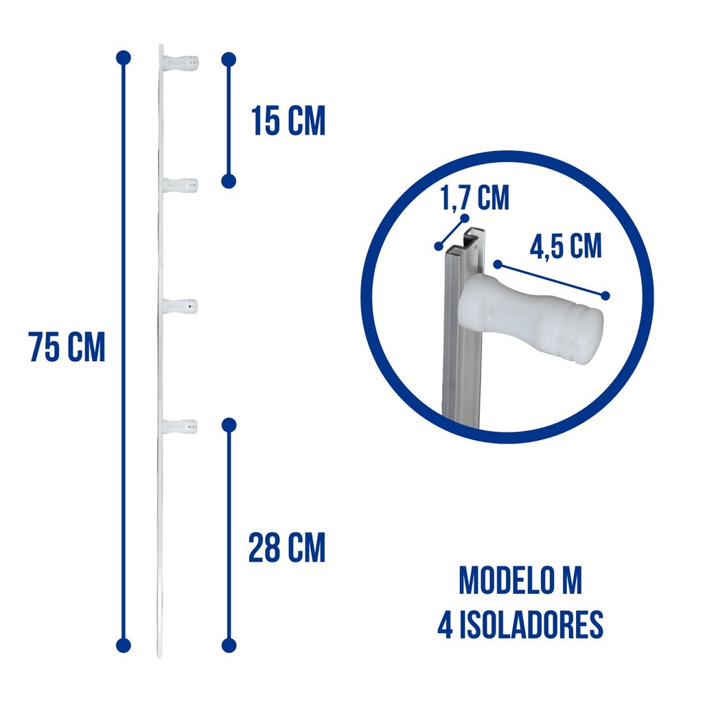 Kit com 10 Hastes em M de Alumínio para Cerca Elétrica – 75cm com 4 Isoladores por haste Descrição do Produto:Desenvolvido para oferecer máxima resistência e durabilidade, as Hastes em M para Cerca Elétrica é a escolha ideal para reforçar a segurança de imóveis residenciais, comerciais e industriais. Fabricadas em alumínio de liga especial, as hastes possuem alta resistência às intempéries e garantem proteção contínua ao seu patrimônio. Benefícios: Produzidas em alumínio de alta qualidade e liga especial. Equipadas com isoladores em termoplástico de alta resistência elétrica e proteção anti-UV. Excelente durabilidade contra ações do tempo (sol, chuva e ventos). Produto robusto, com baixa necessidade de manutenção. Garante segurança eficiente em todo o perímetro da instalação. Aplicações:Ideal para instalação em: Residências Hotéis e pousadas Shoppings e centros comerciais Galpões e indústrias Estacionamentos, parques e jardins Especificações Técnicas: Material da haste: Alumínio liga especial Formato da haste: Perfil M Medidas da haste: 3/8” x 75 cm Tipo de isolador: Termoplástico de alta resistência e proteção UV Quantidade de isoladores por haste: 4 unidades Diferenciais: Produto novo, direto de fábrica. Alta resistência mecânica e elétrica. Ótima estética para o sistema de segurança.