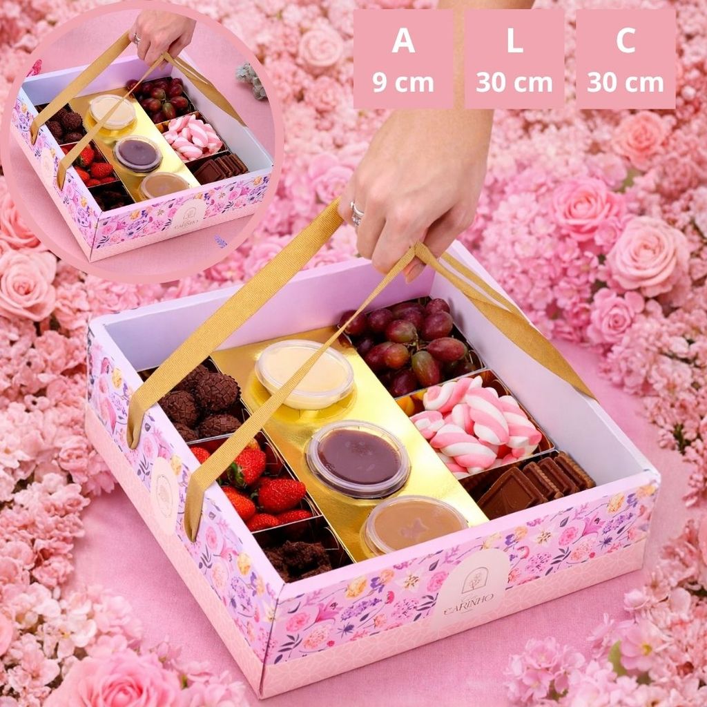 MEDIDAS DA CAIXA MONTADA: 30 cm comprimento 30 cm largura 9 cm altura OBSERVAÇÕES: Possui a tampa de acetato; Os vidros são vendidos separadamente; Acompanha as divisórias, o berço para os potes, e potes de 100ml; As caixas não acompanham doces. As imagens são ilustrativas para demonstração do produto;