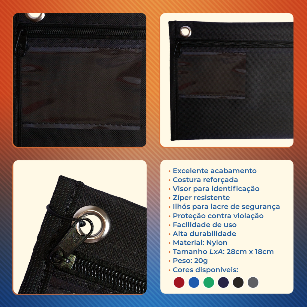 10 Malotes Pasta Documentos Escritório Contabilidade 28x18 Kit de 10 malotes ideais para organização eficiente de documentos de escritório, perfeito para uso em ambientes contábeis. Feito em nylon resistente, possui 28 cm de largura e 18 cm de altura, proporcionando segurança e praticidade no transporte e armazenamento de papéis importantes. Com zíper e lavável, é uma opção versátil e durável para o dia a dia. Especificações Técnicas: Medidas: 28x18cm Material: Nylon Acabamento: Viés Preto, contém visor para identificação e ilhós Produto Lavável FABRICAÇÃO PRÓPRIA, com garantia contra defeitos. MARCA: ZIPP BOLSAS E ESTOJOS Presente no mercado há mais de 20 anos, somos especialistas na confecção de bolsas, mochilas, acessórios e brindes comerciais. Tudo que sua empresa precisa em um só lugar!