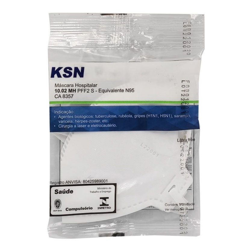Código 10.02 - PFF2 S - CA 8357 - Cor: Branca.Composição: Confeccionado em quatro camadas, sendo: camada externa de fibra sintética de polipropileno; camada meio de fibras sintética estrutural;camada filtrante de fibra sintética com tratamento eletrostático, camada interna de fibra sintética de contato facial. Com tirantes de cabeça de elástico parasustentação da peça facial e tira metálica para ajuste sobre o septo nasal.Respirador conforme norma NBR 13698 para Peça Semifacial Filtrante. ANVISA 80425989001 - Classificação de risco: I.Certificação INMETRO sob nº BRP235091 em conformidade com os requisitos estabelecidos pela Portaria nº 561, de 23 de Dezembro de 2014.INDICAÇÃO DE USO: - Indicado para proteção das vias respiratórias dos trabalhadores da área da saúde contra exposição de agentes biológicos causadores detuberculose, rubéola, SRAG/SARS, varicela, sarampo, gripes, etc. e certos aerodispersóides em faixa de tamanho de partículas de 0,1 a 10 micra (diâmetro aerodinâmico médio) ou maiores, incluindo as geradas por eletrocautério, cirurgia a laser entre outros instrumentos médicos elétricos.- Este respirador oferece EFB - Eficiência de Filtração Bacteriológica > 99% e resistência á penetração de sangue e outros fluidos corpóreos.- Somente para uso contra aerossóis sólidos e líquidos base água, poeiras, névoas e fumos, nas áreas de manutenção.Deve ser utilizado mediante o conhecimento e aprovação das áreas de Higiene, Segurança e Medicina do Trabalho ou responsável pela empresa.É de uso pessoal e intransferível.